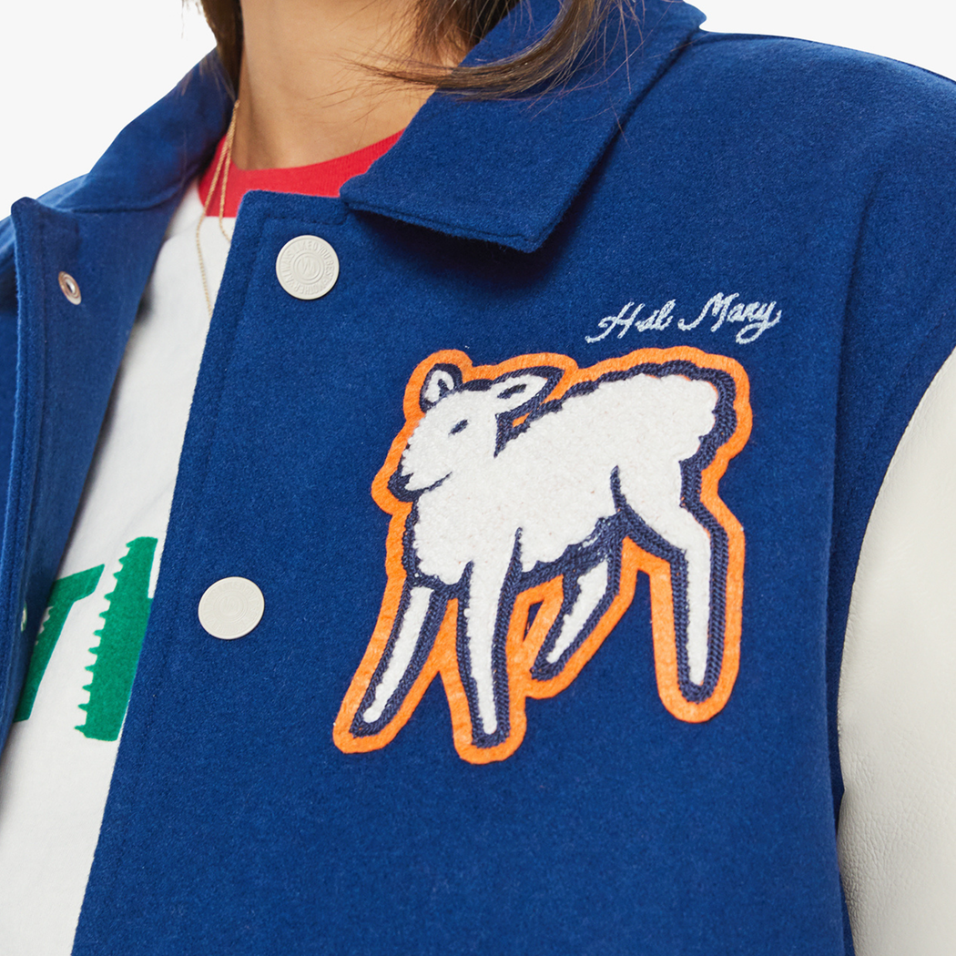 MOTHER's take on the varsity jacket is designed with a collar, side slit pockets, buttons down the front and ribbed hems. Made from a wool blend, Away Game is a navy with off-white sleeves, red striped details and vintage-inspired chenille patches, pins and needlepoint throughout.