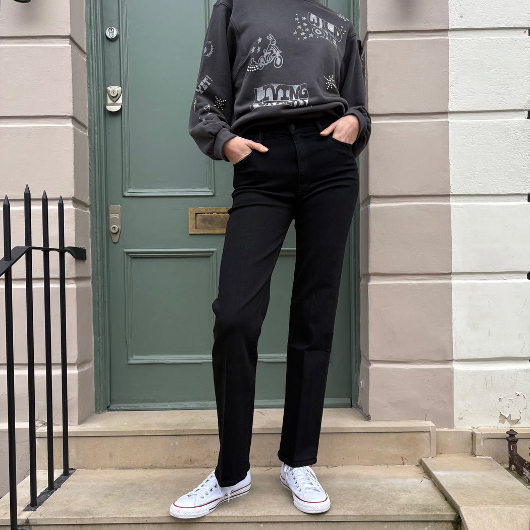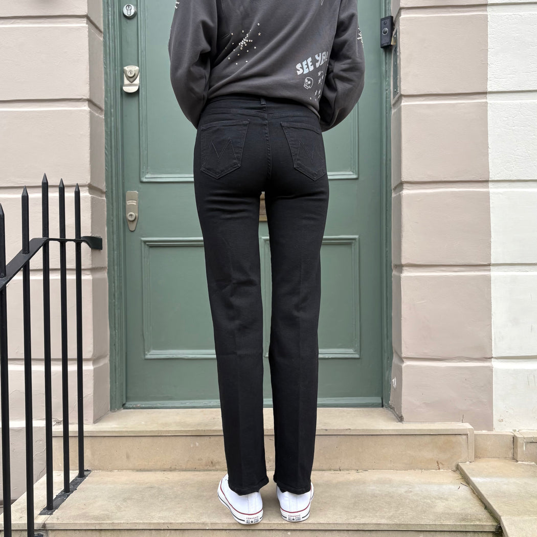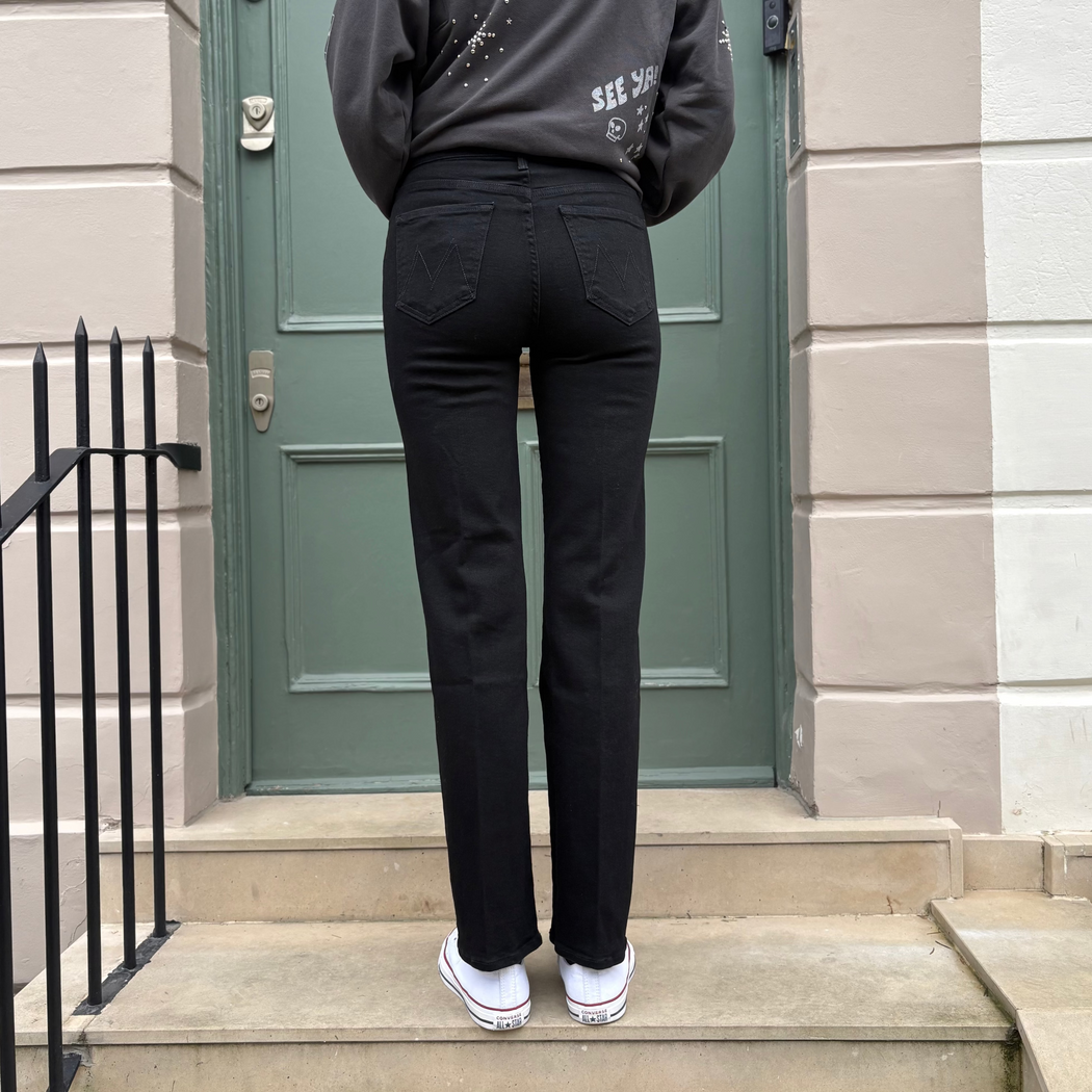 A high-rise straight-leg jean with a 32-inch inseam and a clean hem. Made from stretch denim, Nighty Night is a true black with tonal hardware.