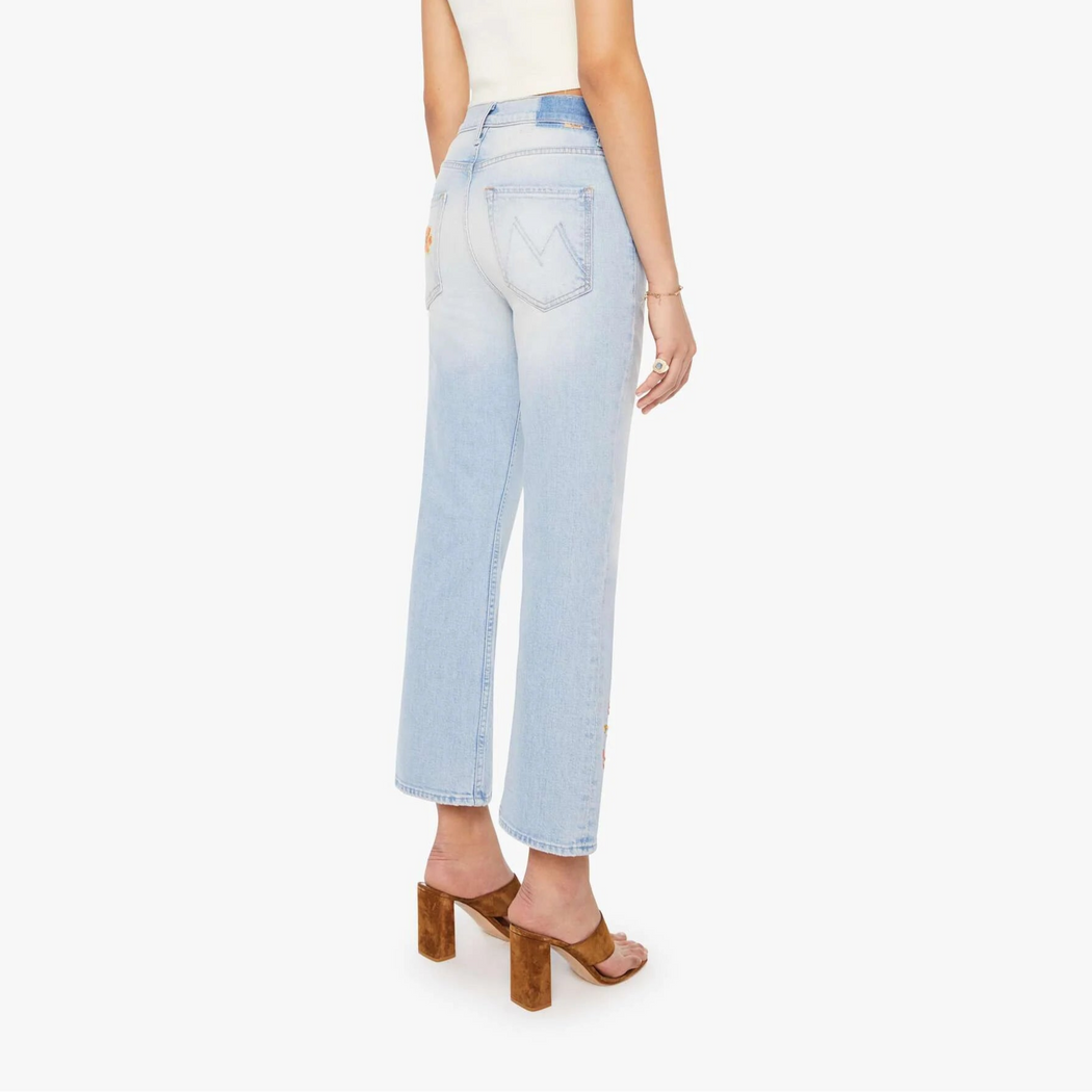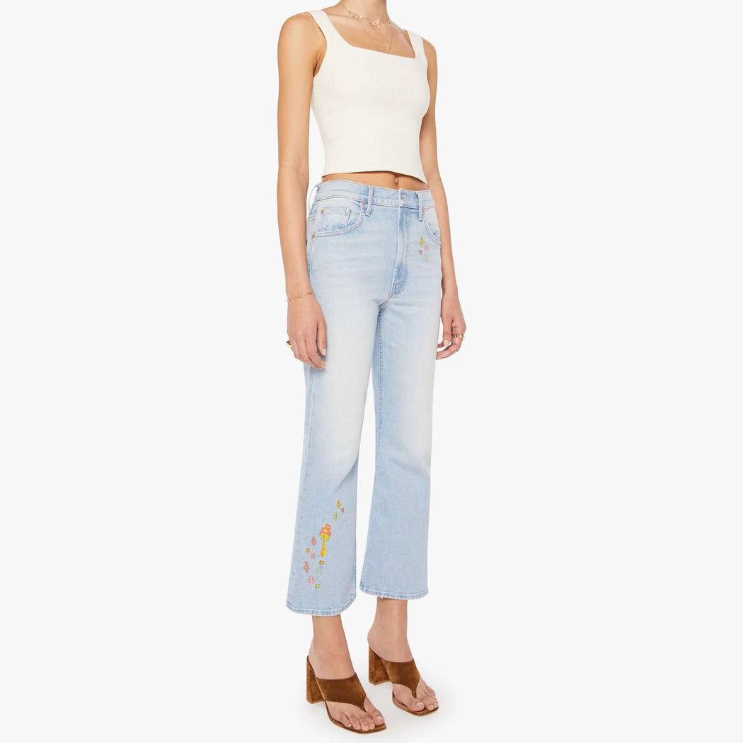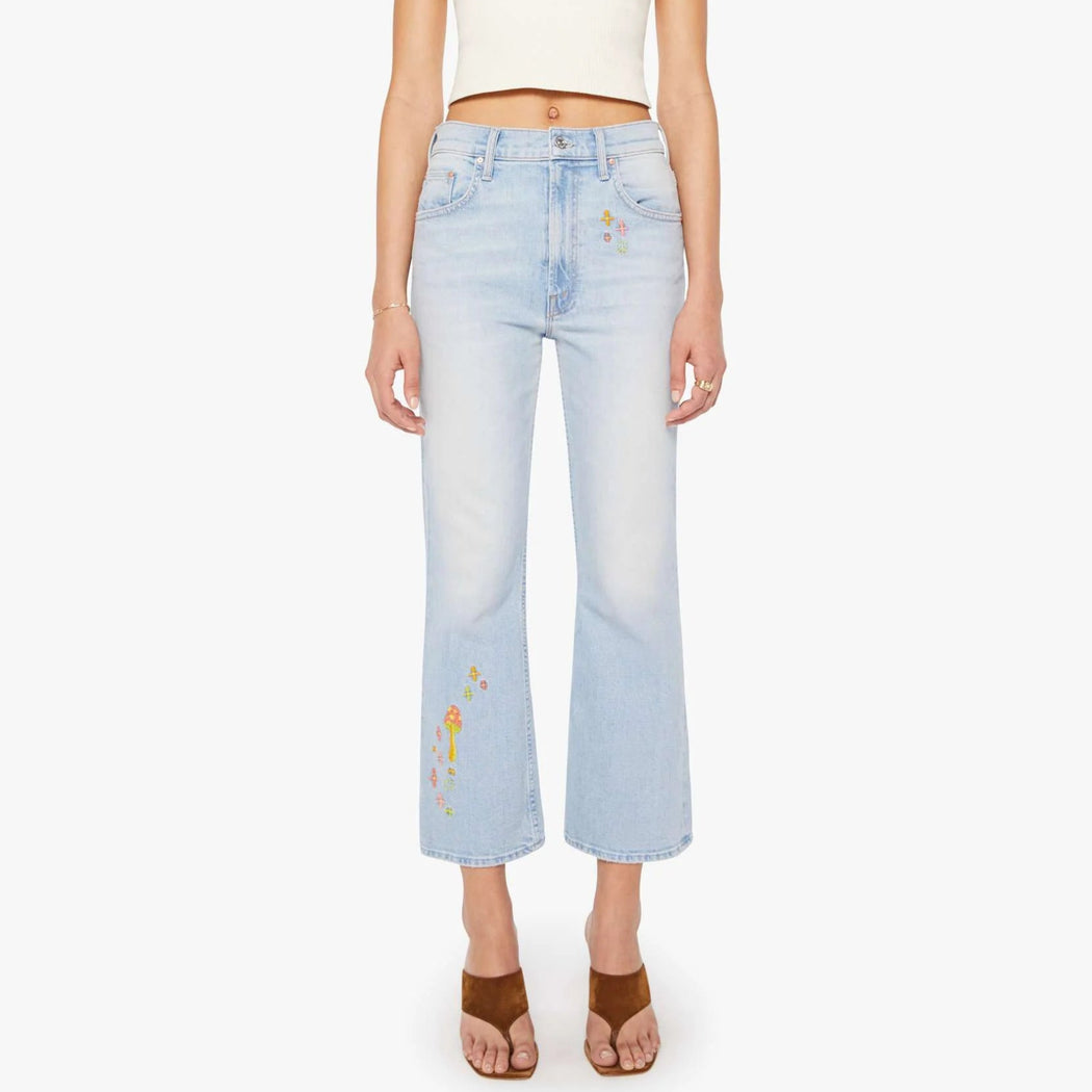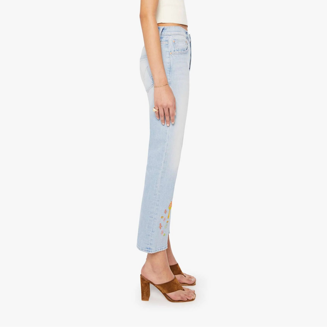 A super high-waisted jean with a wide, curved leg, an ankle-length inseam and a clean hem. Made from SUPERIOR denim, Did You Bring Me Anything? is a dark blue wash with whiskering and fading at the knees.