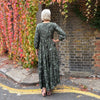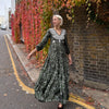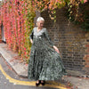 This beautiful dress is carefully handmade and hand embroidered in India. The delicate embroidery is done by a group of talented women in Mumbai. The Frangipani dress features a V-neckline 3/4 length sleeves with a slight balloon and a full length skirt.