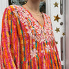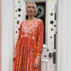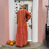 This beautiful dress is carefully handmade and hand embroidered in India. The delicate embroidery is done by a group of talented women in Mumbai. The Frangipani dress features a V-neckline 3/4 length sleeves with a slight balloon and a full length skirt.