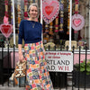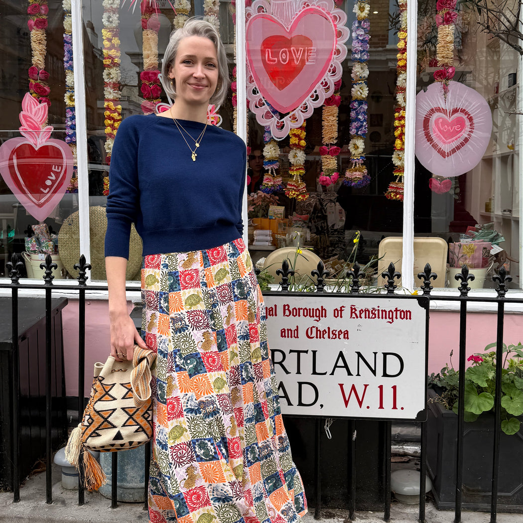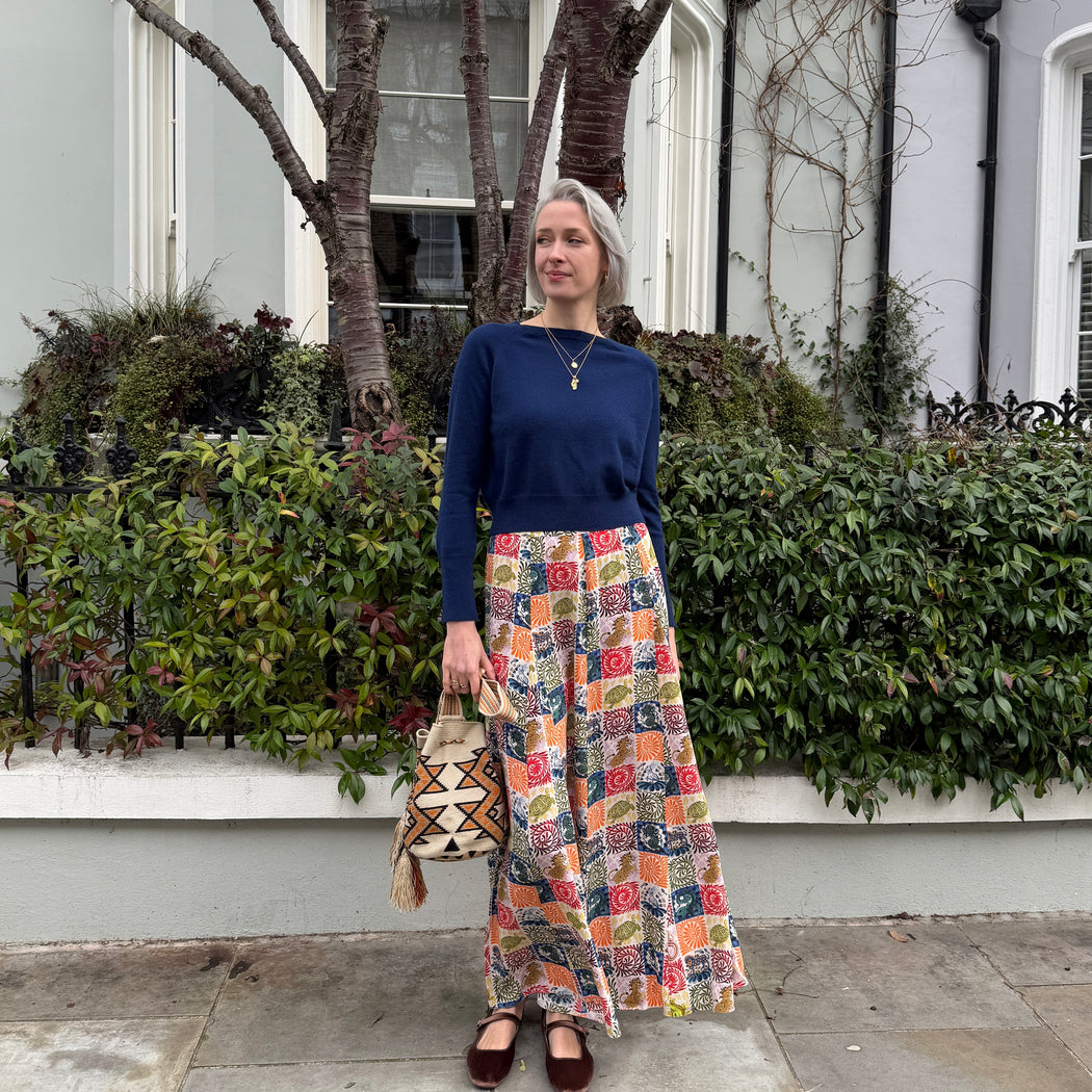 A beautiful floor length skirt in this season 'Wild Tapestry' print. A fluid, silk style that sits on the waist. It has a hidden zip and side pockets. Teamed here with a velvet basic.