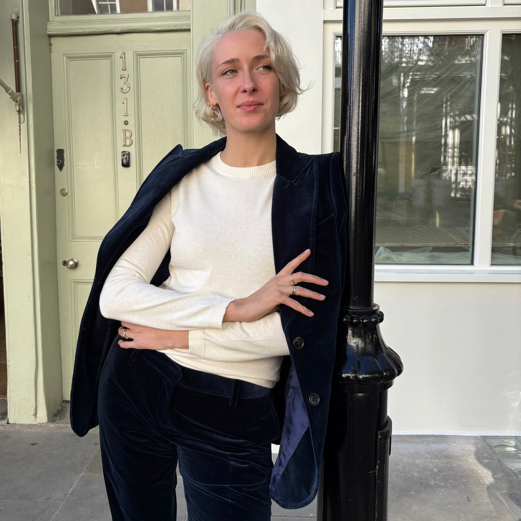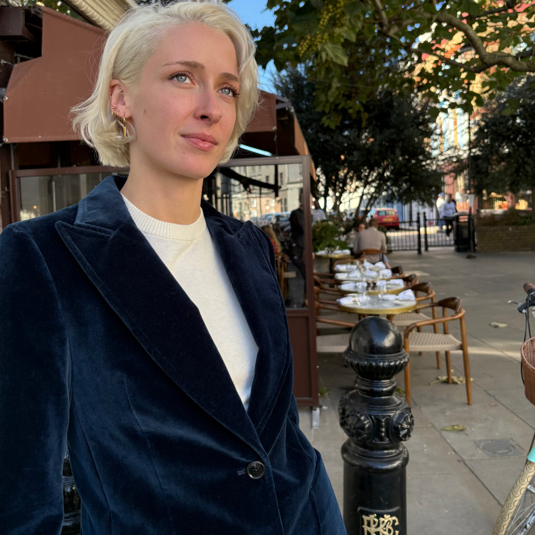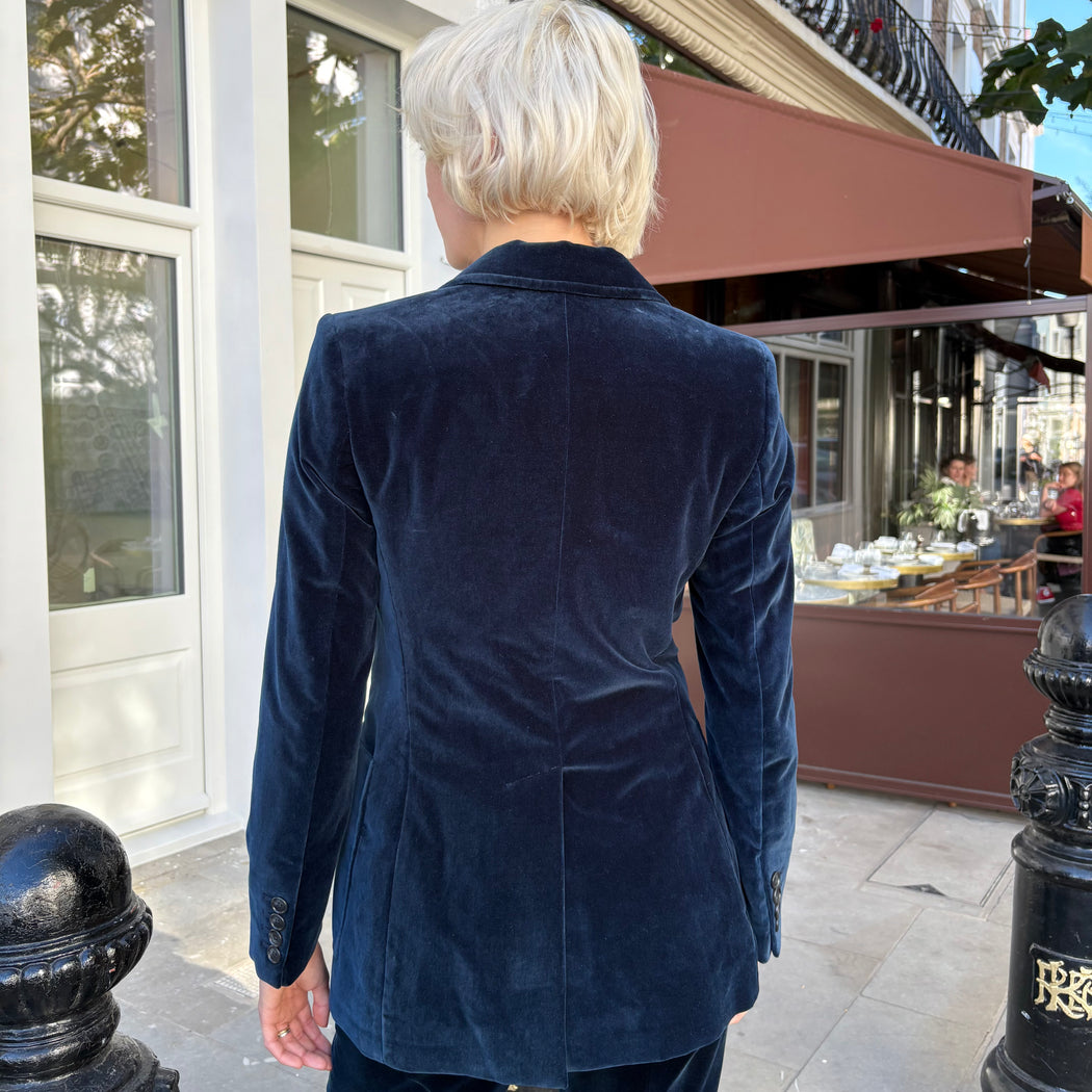 A wonderfully tailored Italian plush velvet jacket with wide lapels and patch pockets, coming in a deep marine blue shade.