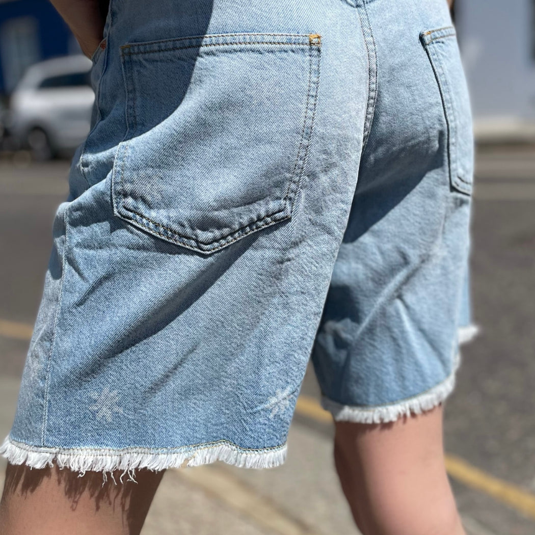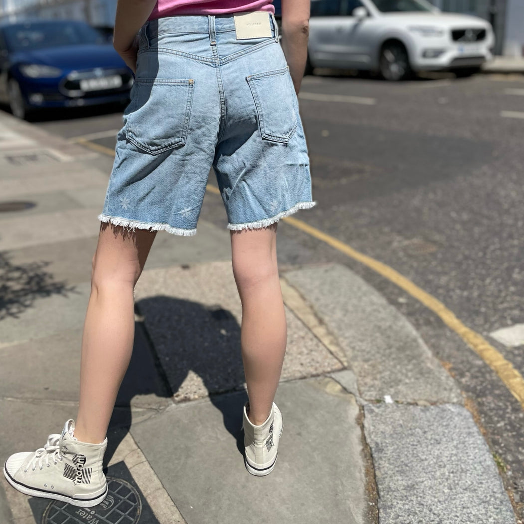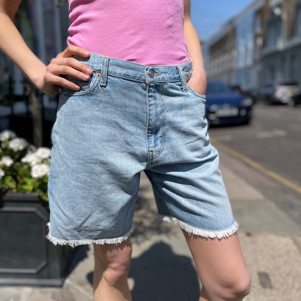 A practical pair of soft denim shorts with a fray hem, sitting mid rise and finishing at a Bermuda short length. Fitted round the waist for a looser shape towards the hem, the size 25 would be ideal for a size UK8.