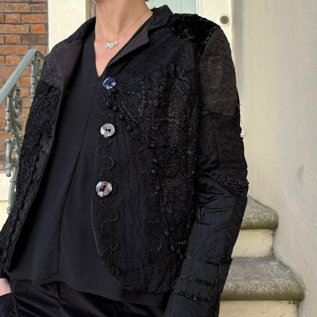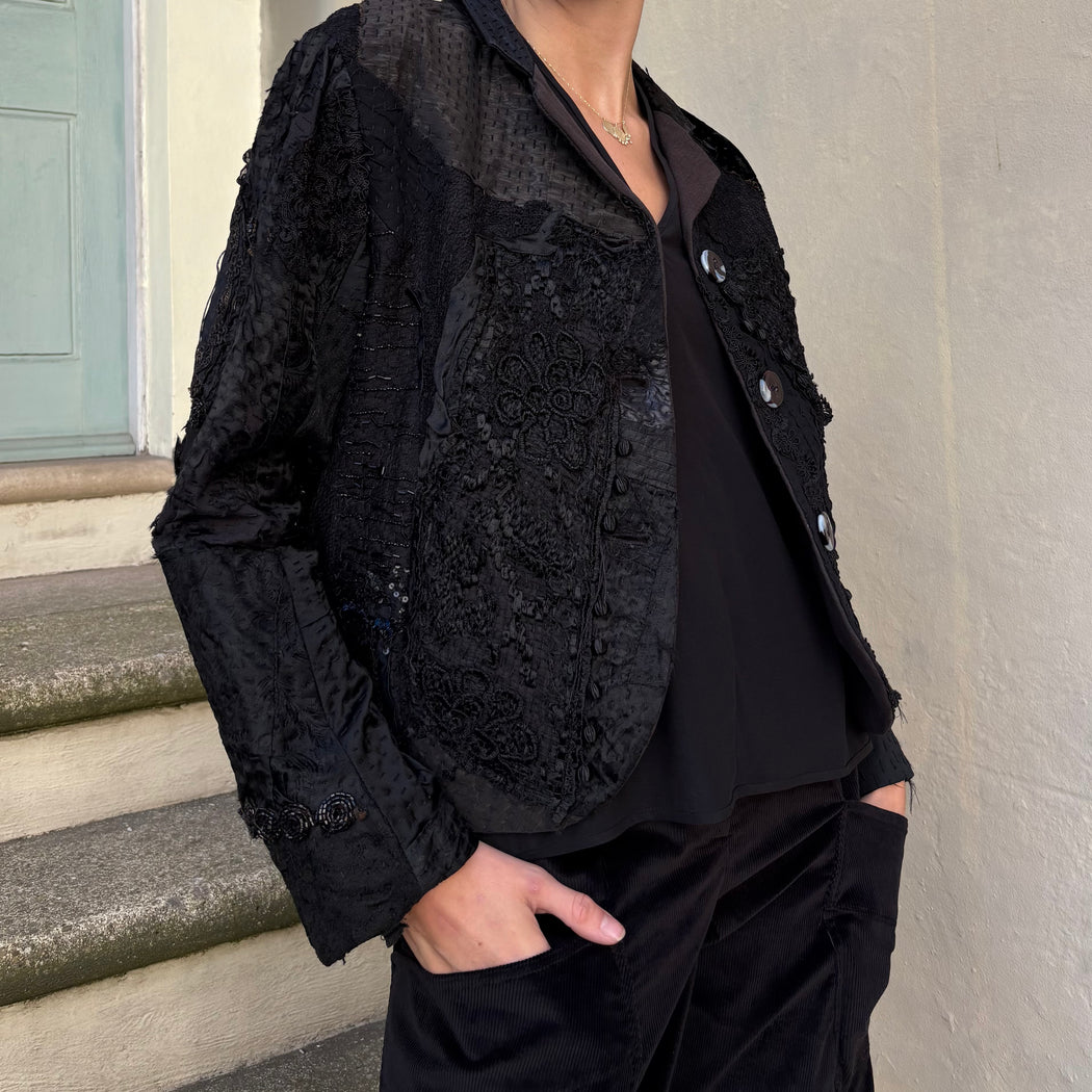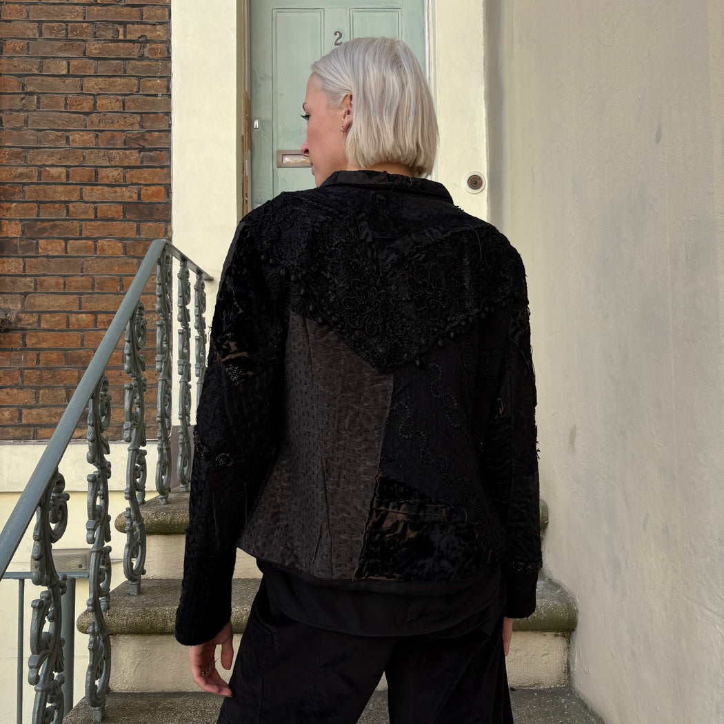 Hand-stitched vintage victorian silk with beautiful embellishment. A neat jacket with a curved hem and button closure does the front.