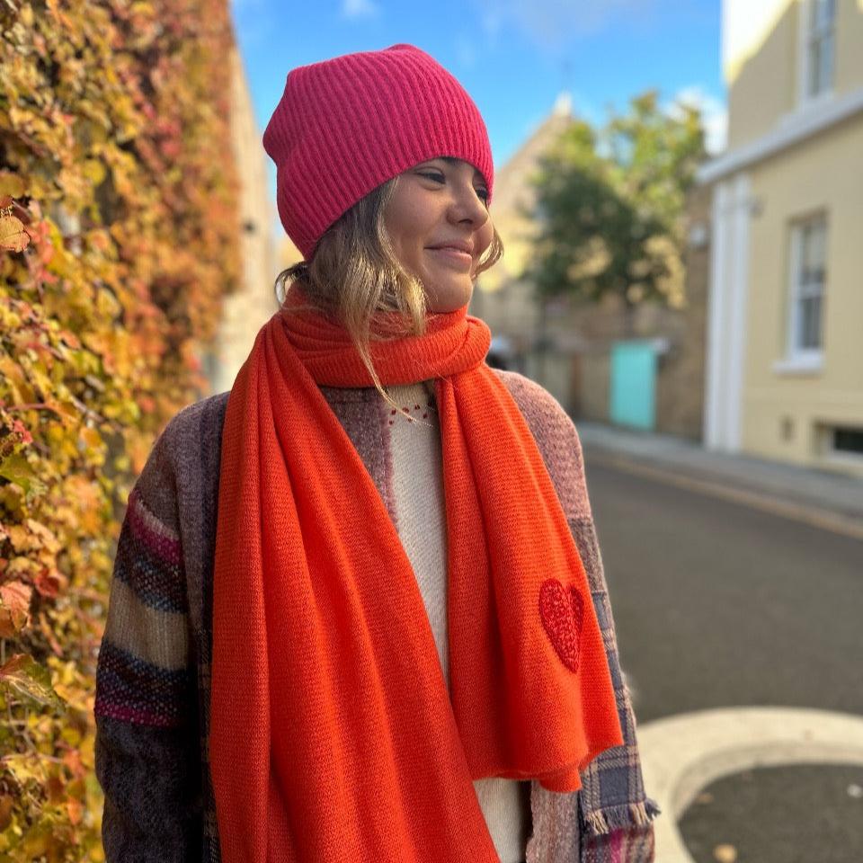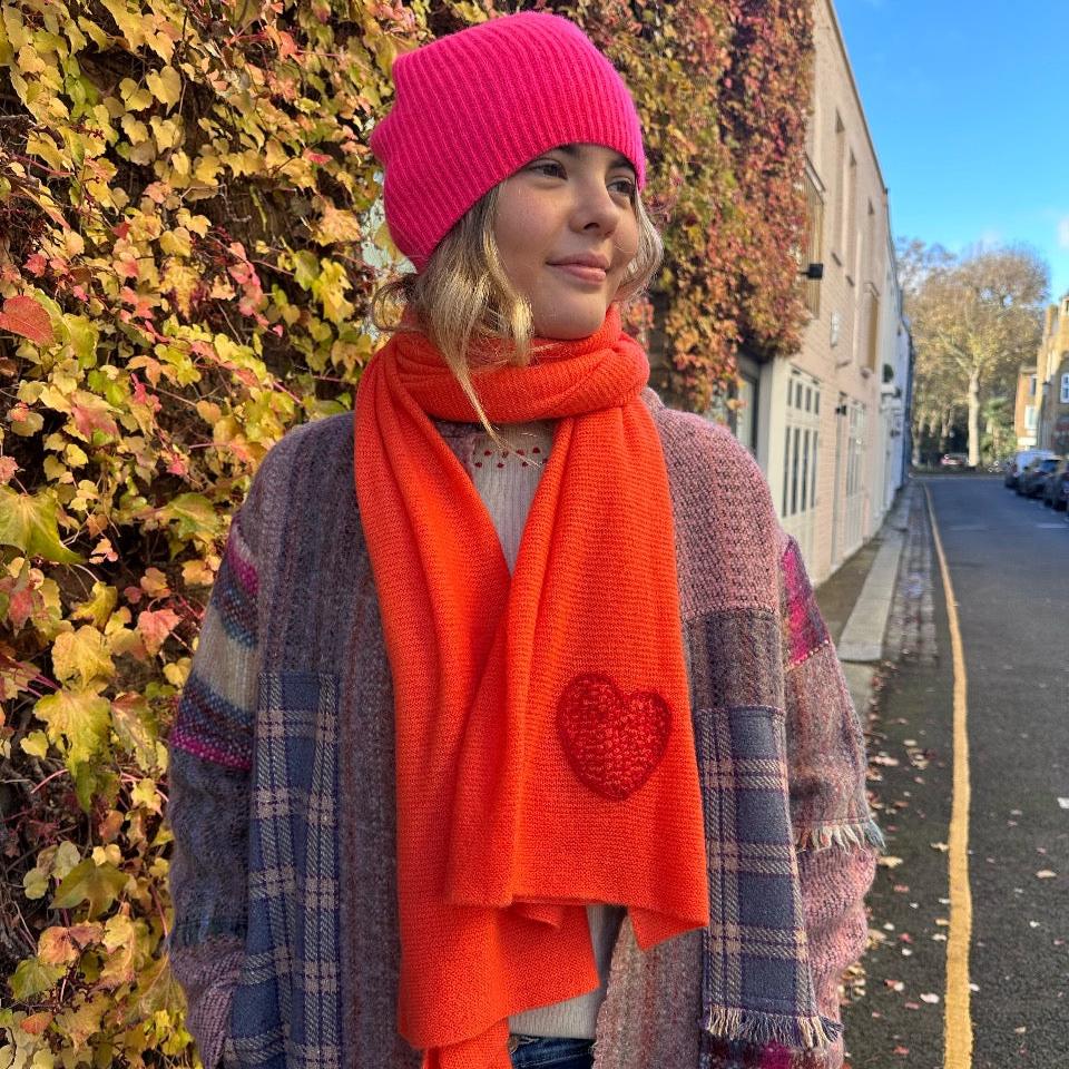 Cash Ca make beautiful luxurious knitwear using traditional knitting techniques and sustainable fibres, being eco conscious is central to their ethos. Made from a gorgeous wool blend in saffron yellow, the pashmina has a soft texture similar to a waffle knit. Shirley has added her signature heart embroidery to the corner.