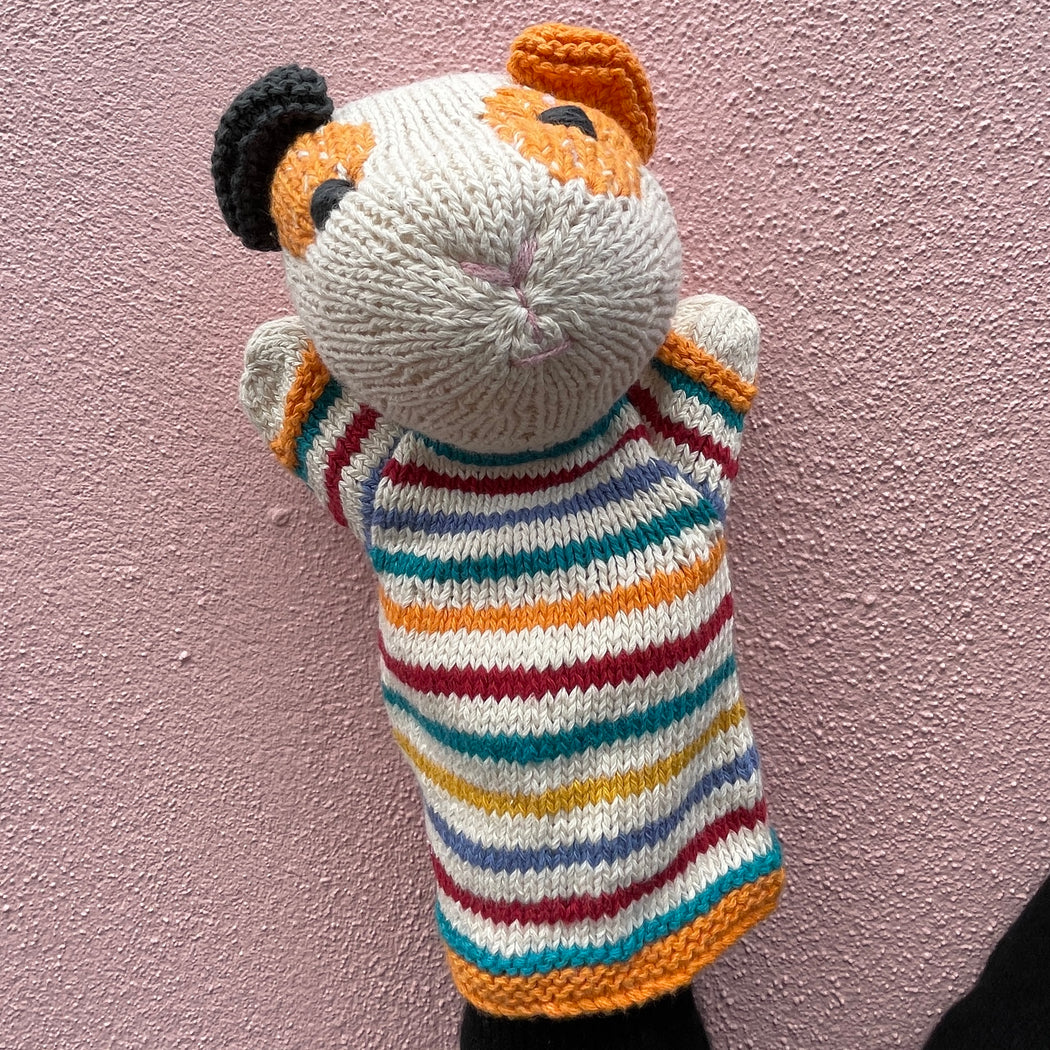 Hand knitted in a organic cotton, these friendly animal puppets are a great first gift for a new born right up to an older child who can play at their own pleasure!