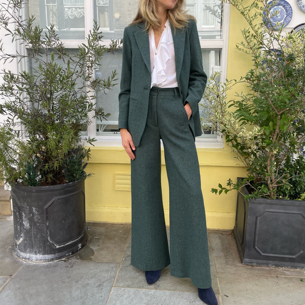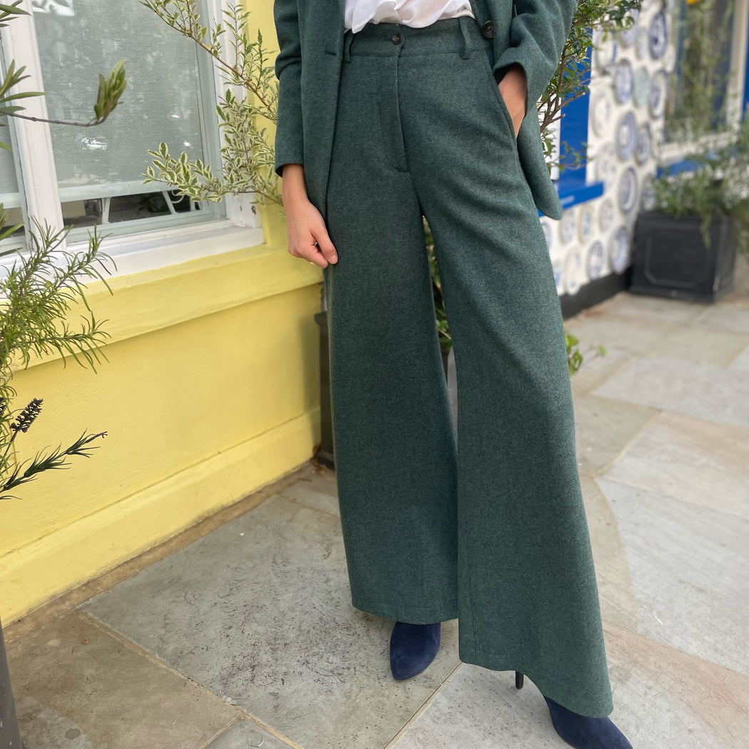 A flattering, easy trouser which are fitted around the waist, floor-length and flared that elongates the figure. Features pockets and belt loops. Model wears XS