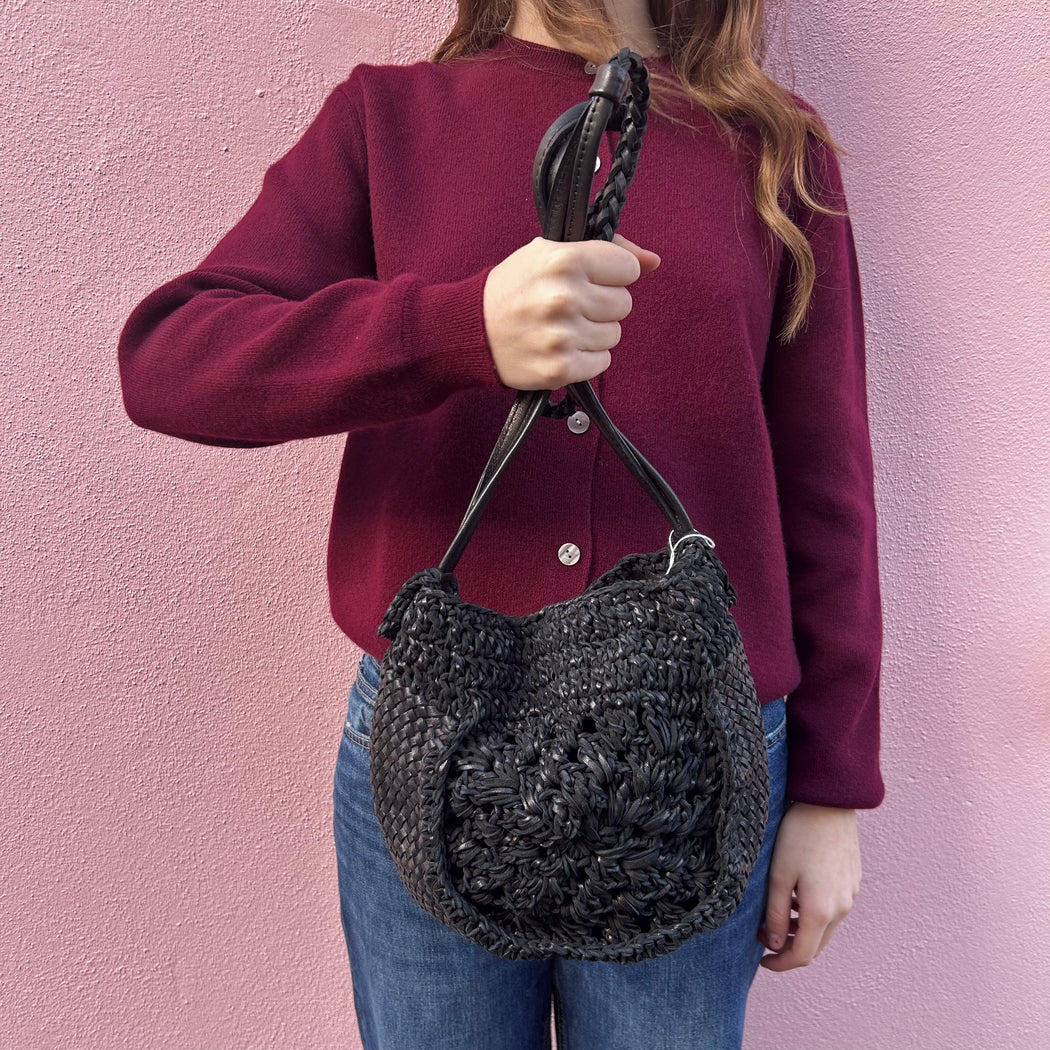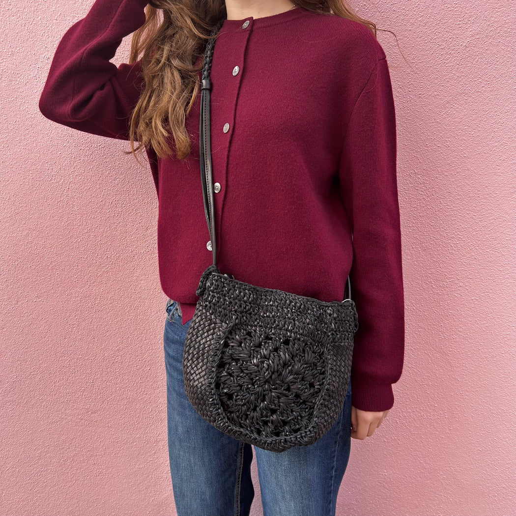 En Shalla Black Crochet Leather Crossbody Bag