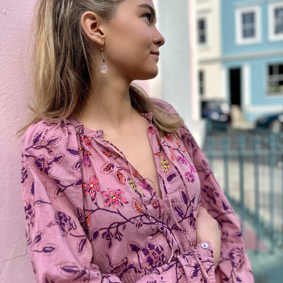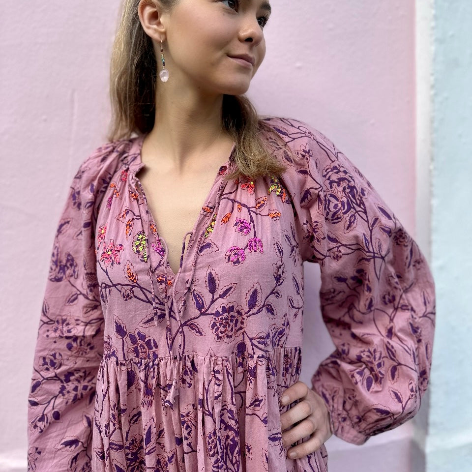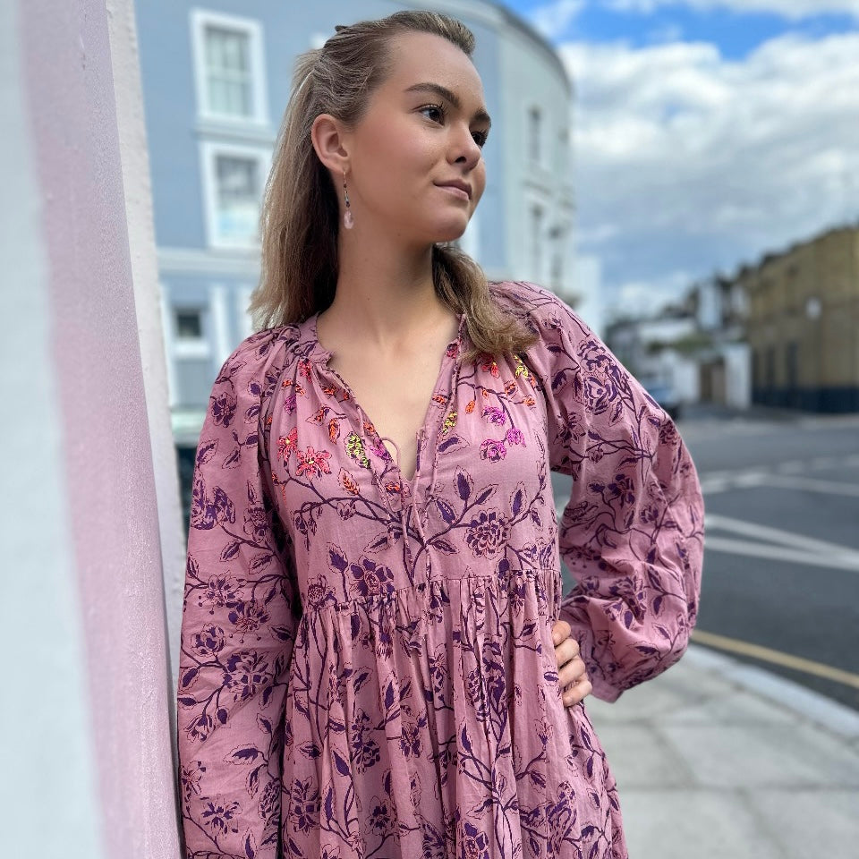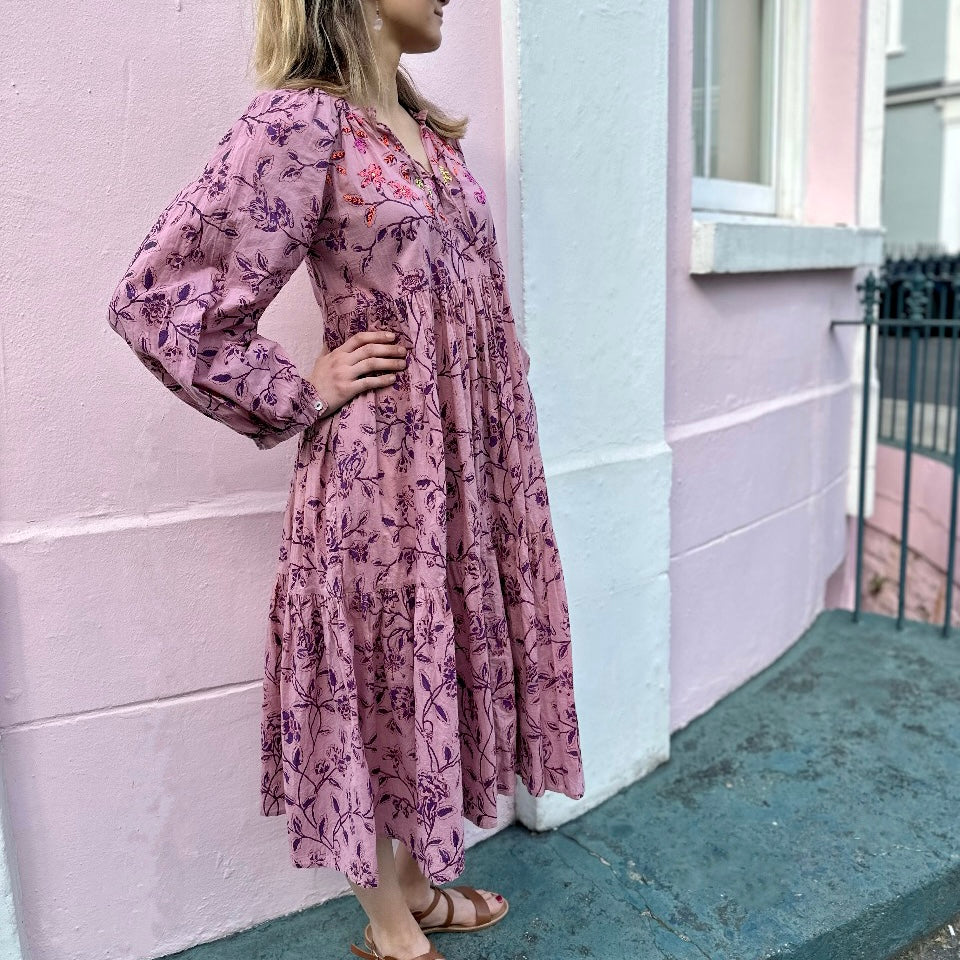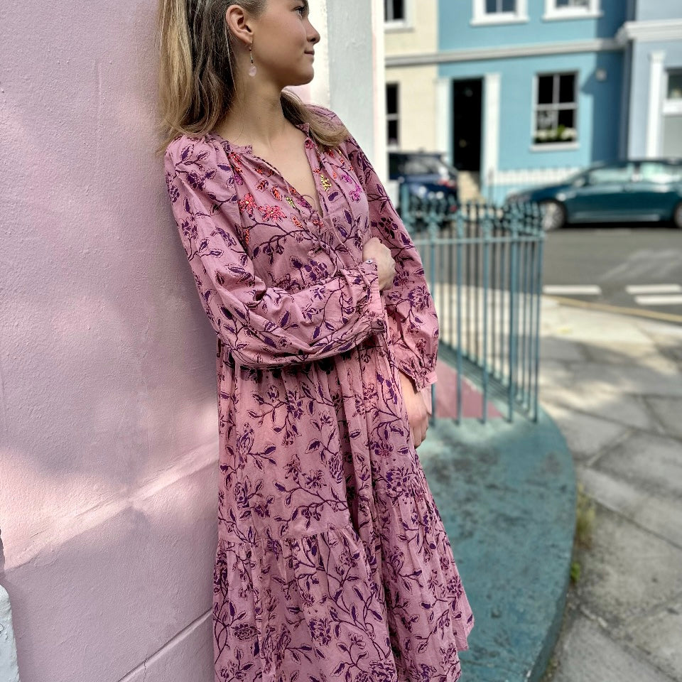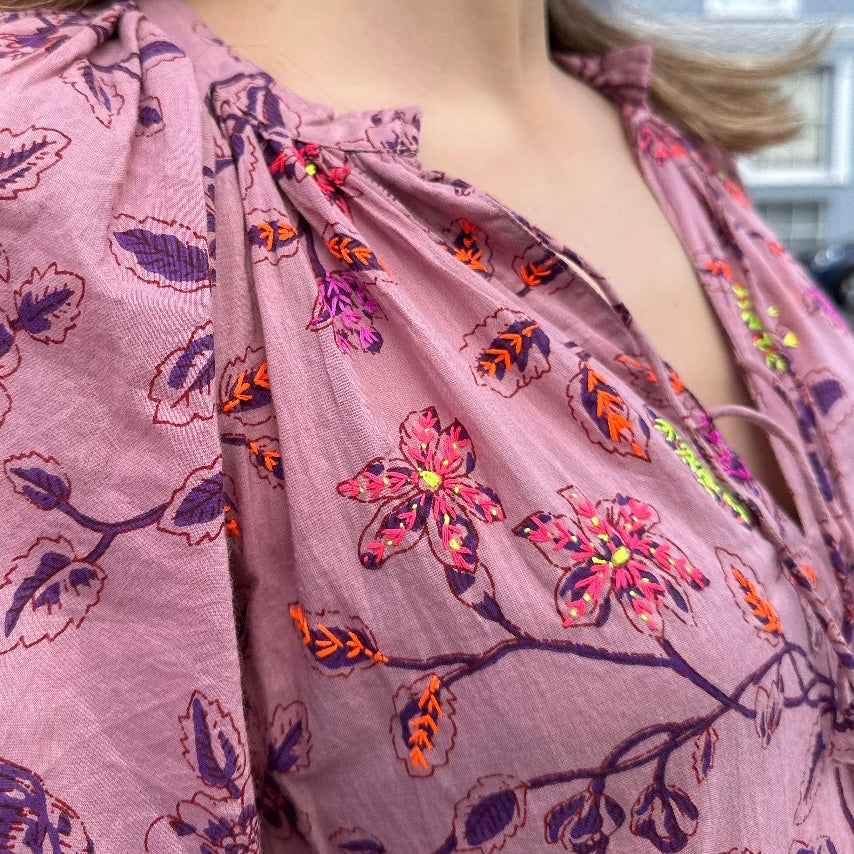 This block-printed dress by Matta NY has been lovingly enhanced. Pulling out the print details in the yoke, Shirley has stitched tonal shades highlighting the floral print.
