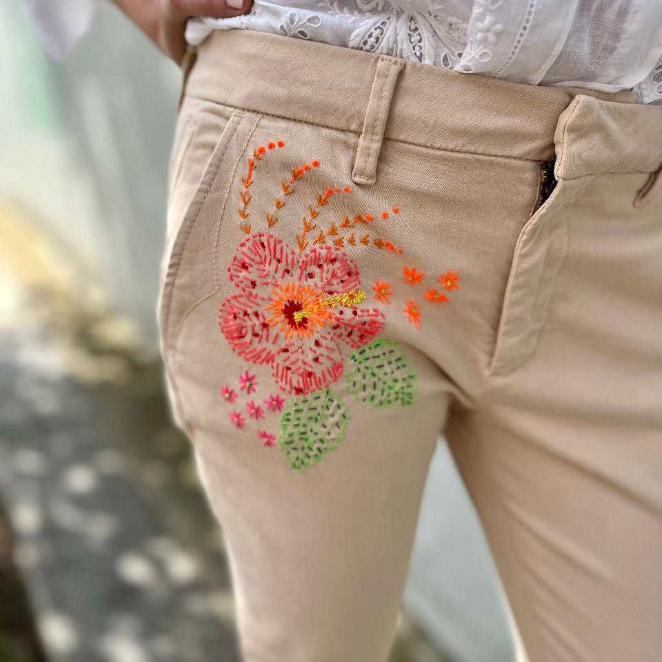 We have collaborated with our longstanding embroider Shirley McLauchlan on this unique collection. Shirley is passionate about repairing and stitching old or damaged textiles and breathing new life into them. Sam and Shirley have picked delicate motifs and bold colours. Each piece will be totally unique and one of a kind, making them more special than their beginning.