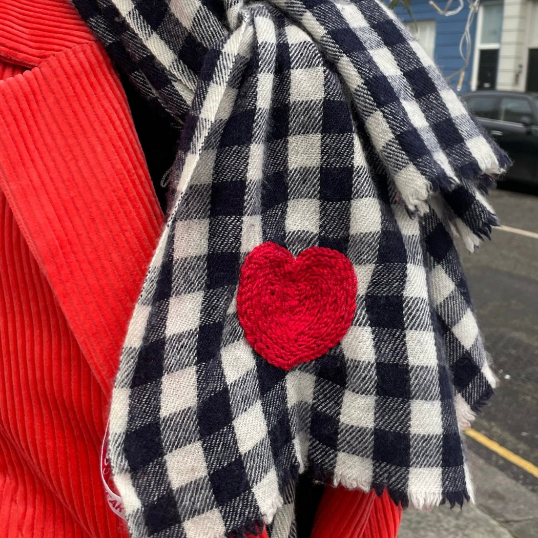 This check combination was made for us in a limited run for our anniversary collection. It has been customised with a hand-embroidered cherry red heart by the ever-talented Shirley McLauchlan.