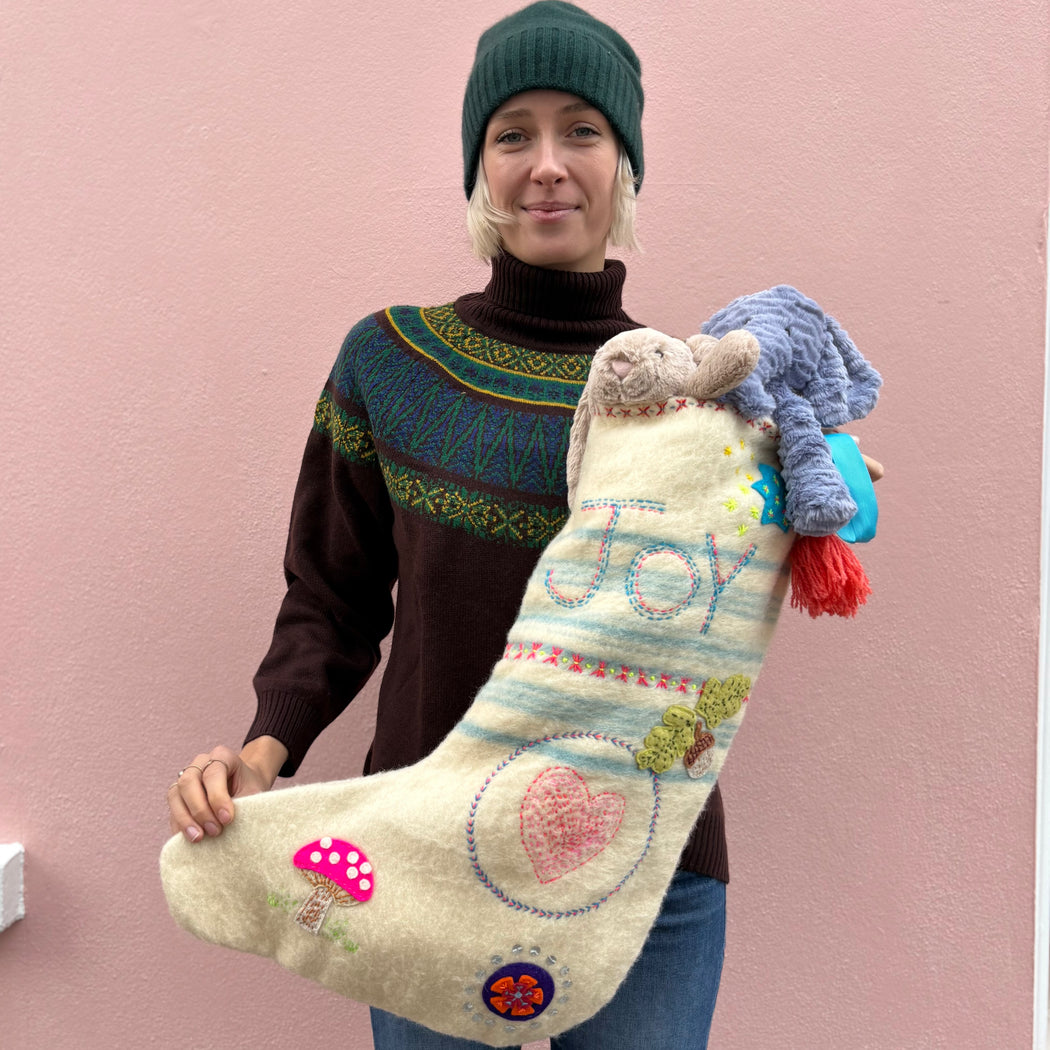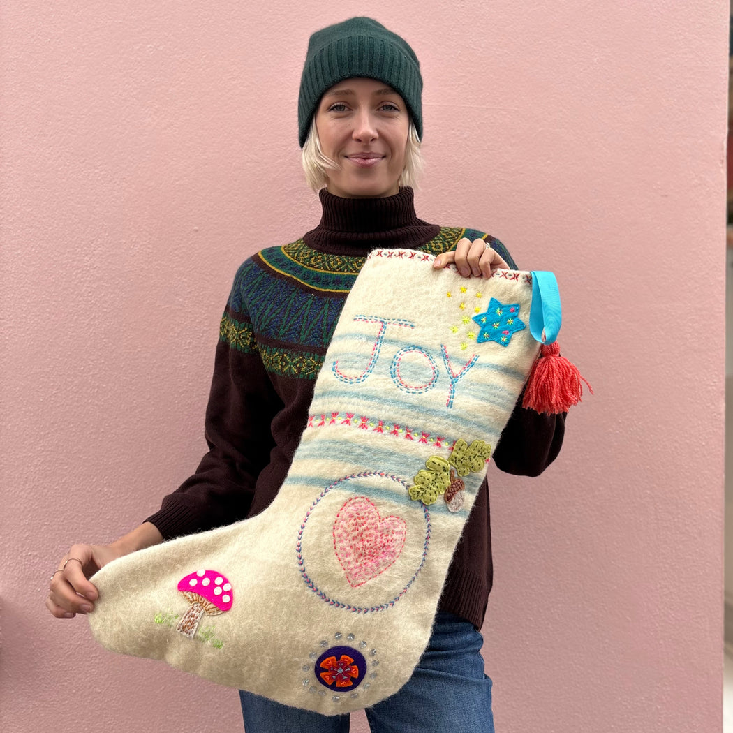 Hand Embroidered Joy Toadstool Large Christmas Stocking