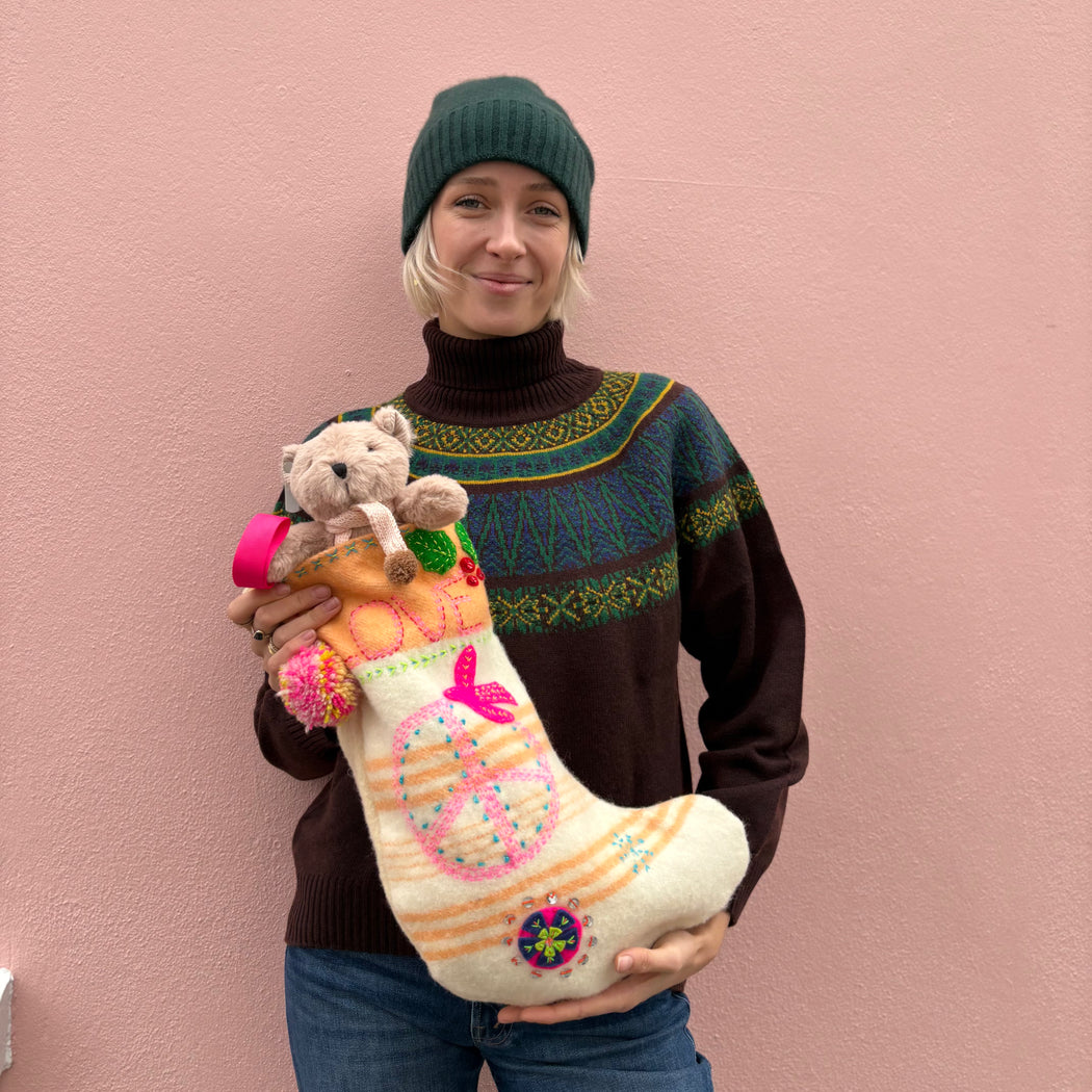 Shirley McLauchlan is a longtime, adored collaborator of the Cross. Her intricate embroidery and use of both pattern and colour come together to make the most magical of creations. A textile by Shirley is a forever piece, once owned, it is always treasured. These exquisite Christmas stockings would outshine the gifts inside!