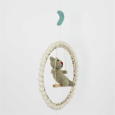 A sweet hand felted baby mobile for a new born, nursery or playroom. A felted mouse dangling from a bamboo swing.
