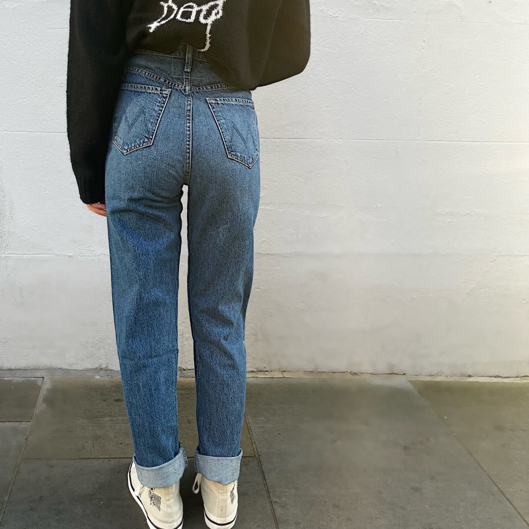 These Mother HTGR Tune UP Hover Cuff Jeans are a straight leg with a slight taper at the turn up cuff. Super high waist and universally flattering. In a lovely mid wash.