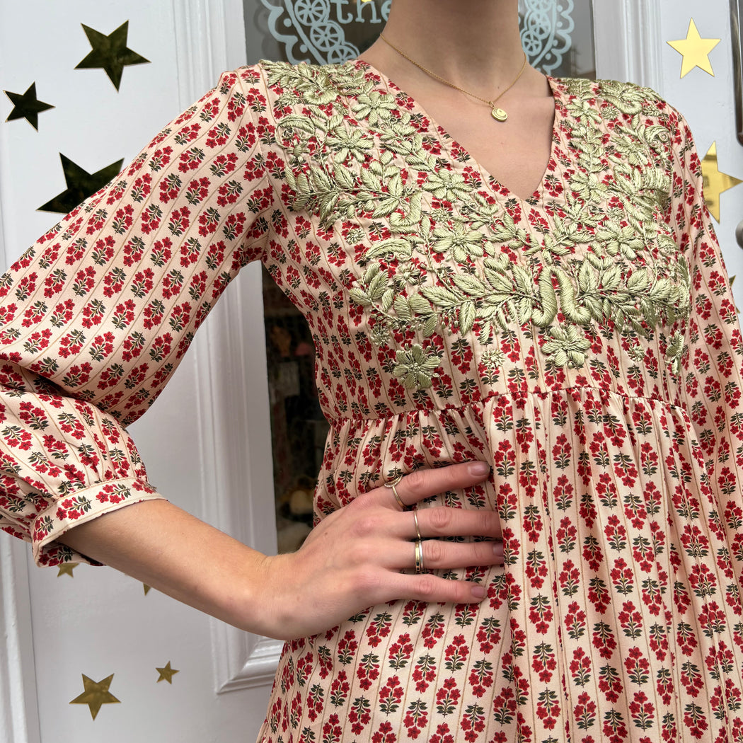 This beautiful dress is carefully handmade and hand embroidered in India. The delicate embroidery is done by a group of talented women in Mumbai. The Frangipani dress features a V-neckline 3/4 length sleeves with a slight balloon and a full length skirt.