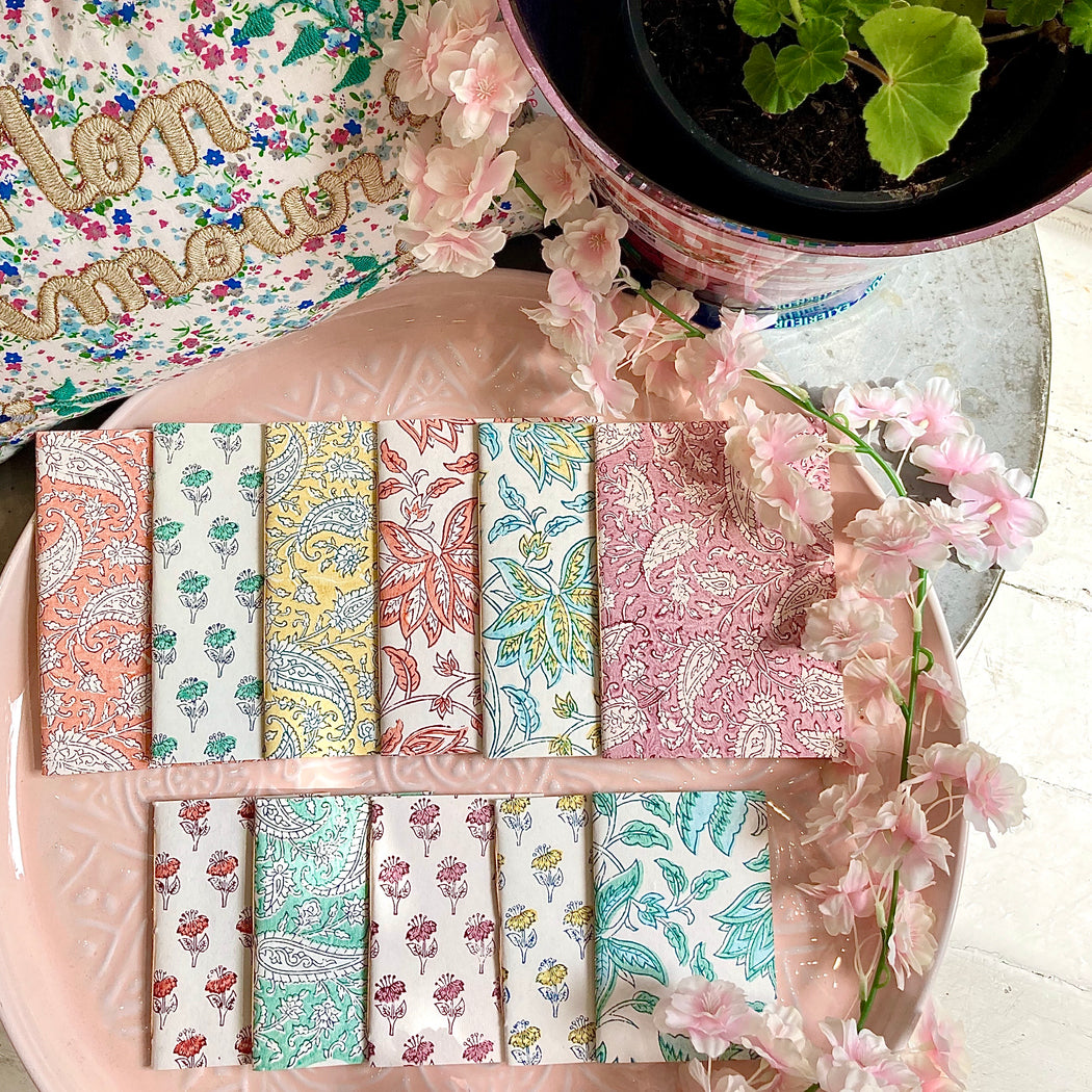 These tree free notebooks are handcrafted in India using traditional techniques. Each notebook cover is beautifully block printed by hand. There are 24 leaves (48 sides) in each notebook carefully hand stitched for an elegant finish.
