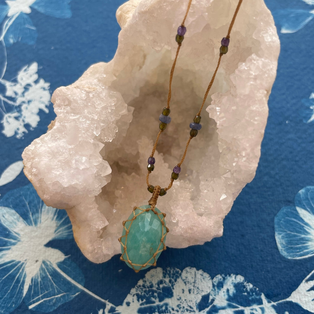 A delicate handmade piece, each Tibetan necklace has a faceted pendant on a resistant coloured thread, strewn with tourmaline and zirconium beads.