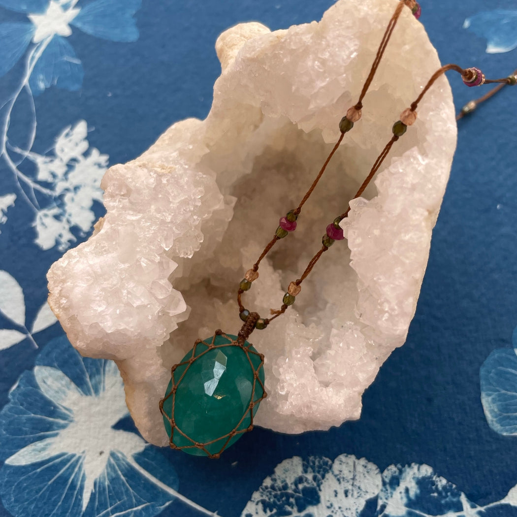 A delicate handmade piece, each Tibetan necklace has a faceted pendant on a resistant coloured thread, strewn with tourmaline and zirconium beads.