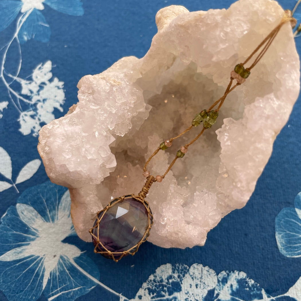 A delicate handmade piece, each Tibetan necklace has a faceted pendant on a resistant coloured thread, strewn with tourmaline and zirconium beads.