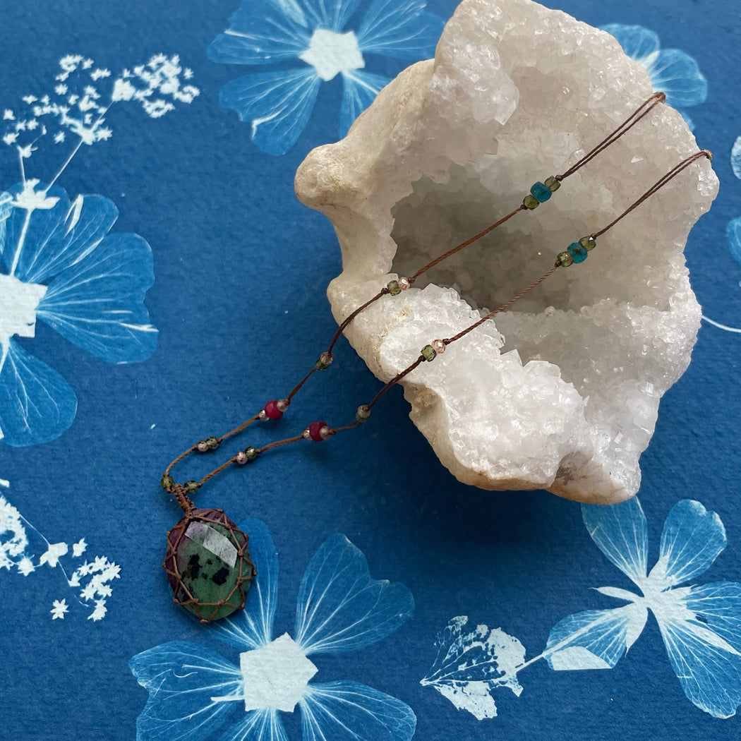 A delicate handmade piece, each Tibetan necklace has a faceted pendant on a resistant coloured thread, strewn with tourmaline and zirconium beads.