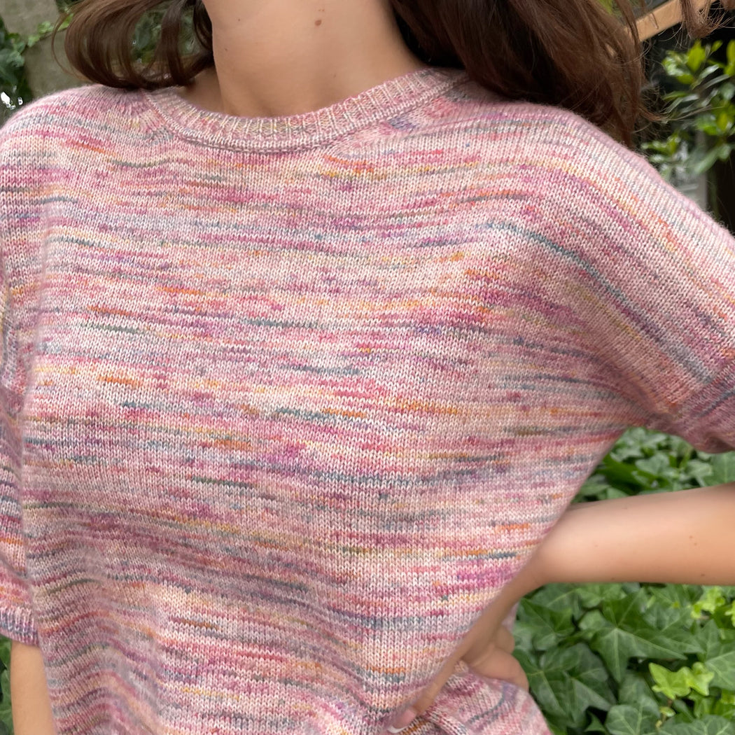 Blended in cotton, Merino and baby Alpaca this jumper is sumptuously soft and lightweight. The fit is casual with a slightly dropped sleeve, and easy t shirt shape. The hues of the rose marl have a warmth to them making the colour easy to wear.