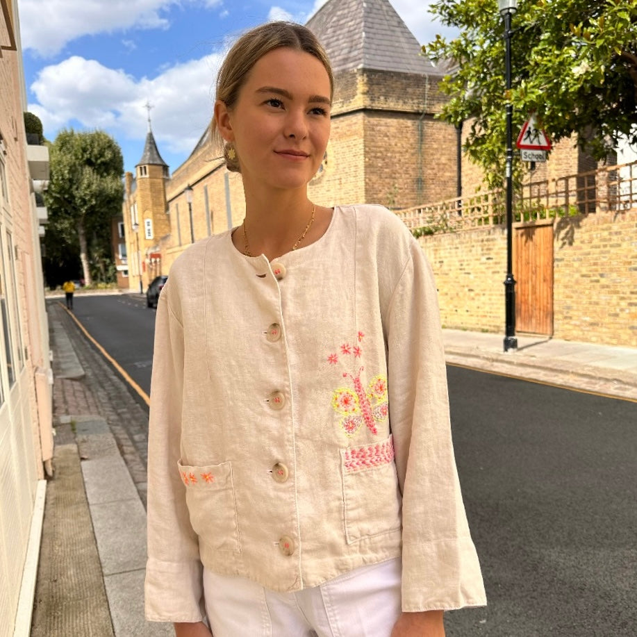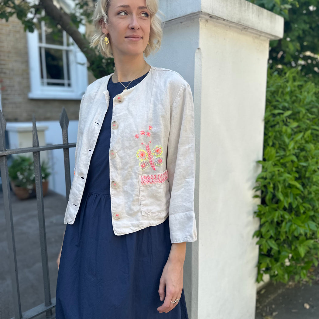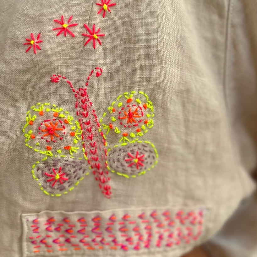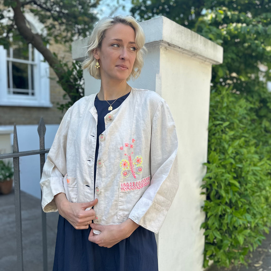 A painters like linen jacket, with a boxy fit and a chunky button closure. Shirley has added beautiful decoration to this otherwise simple piece. Framing the pockets with her classic stitching and a hand embroidered butterfly which is a feature of this collection.