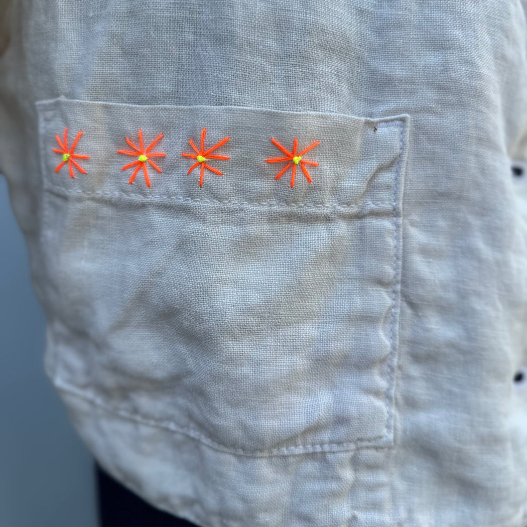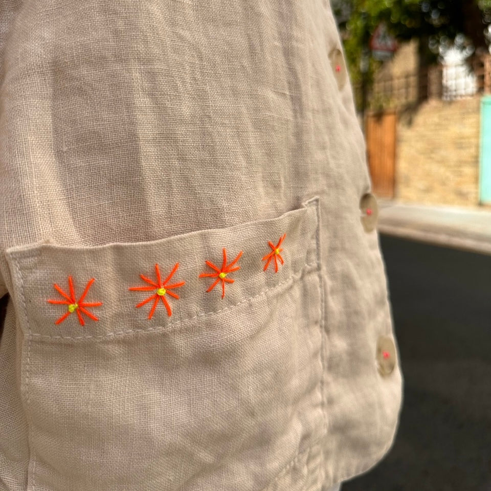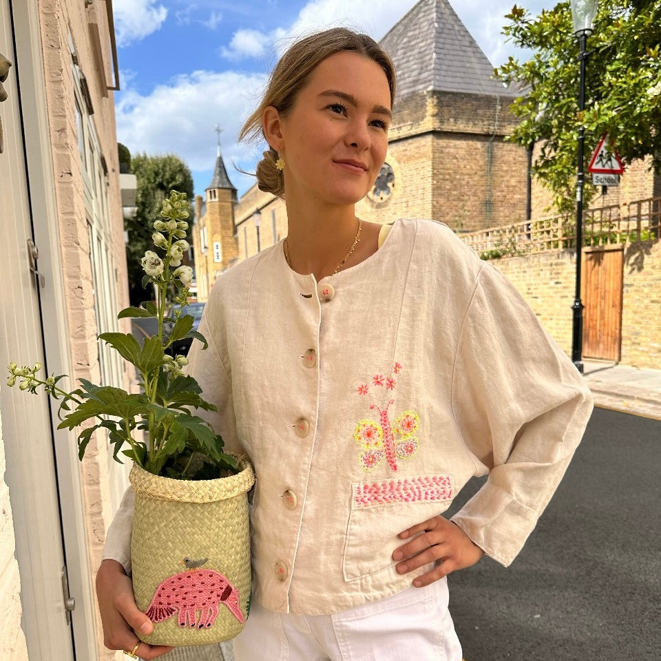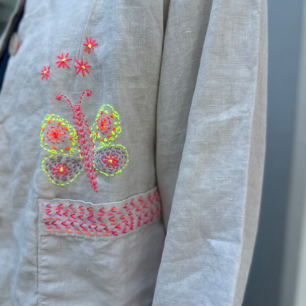 A painters like linen jacket, with a boxy fit and a chunky button closure. Shirley has added beautiful decoration to this otherwise simple piece. Framing the pockets with her classic stitching and a hand embroidered butterfly which is a feature of this collection.