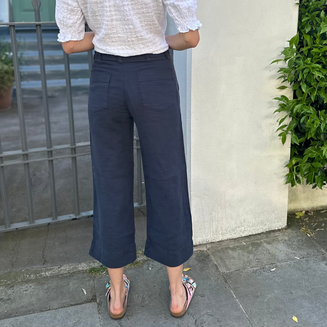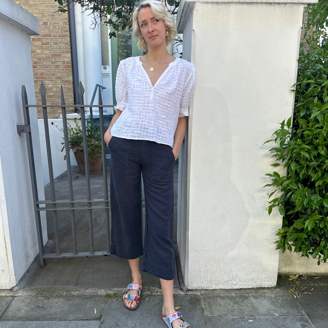 A tailored take on relaxed linen trousers. Ankle length, side pockets with a patch detail, slight kick flare to the bottom of them leg.