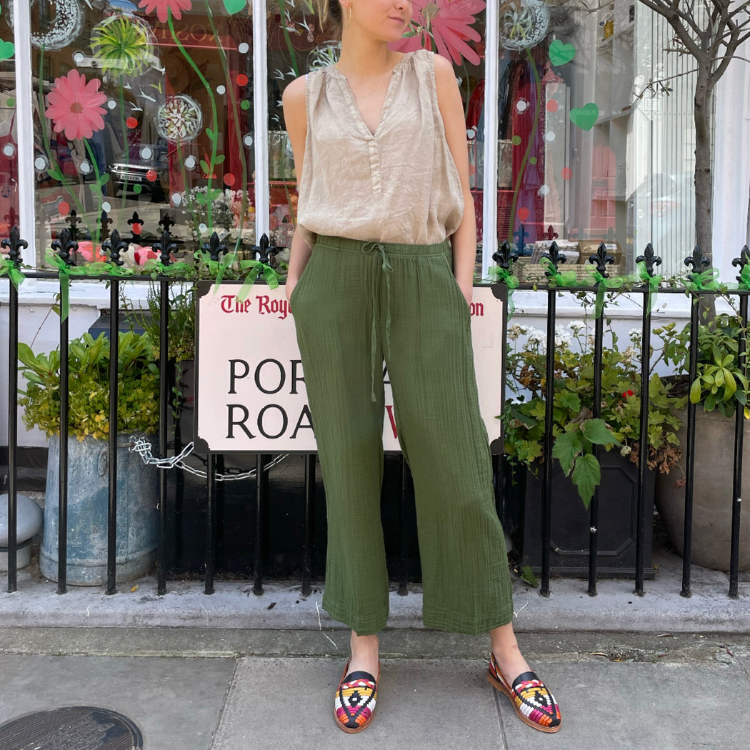 The Franny is crafted in a cotton gauze, drawstring waist, slash pockets and a relaxed straight leg. Your go to summer trouser!