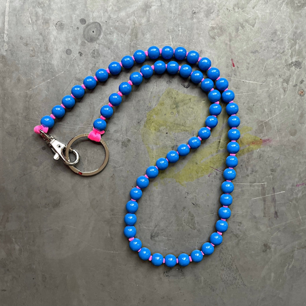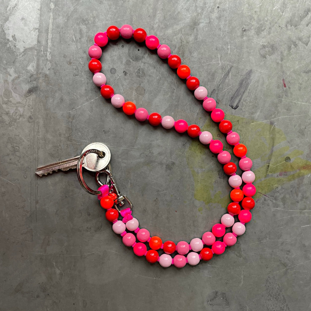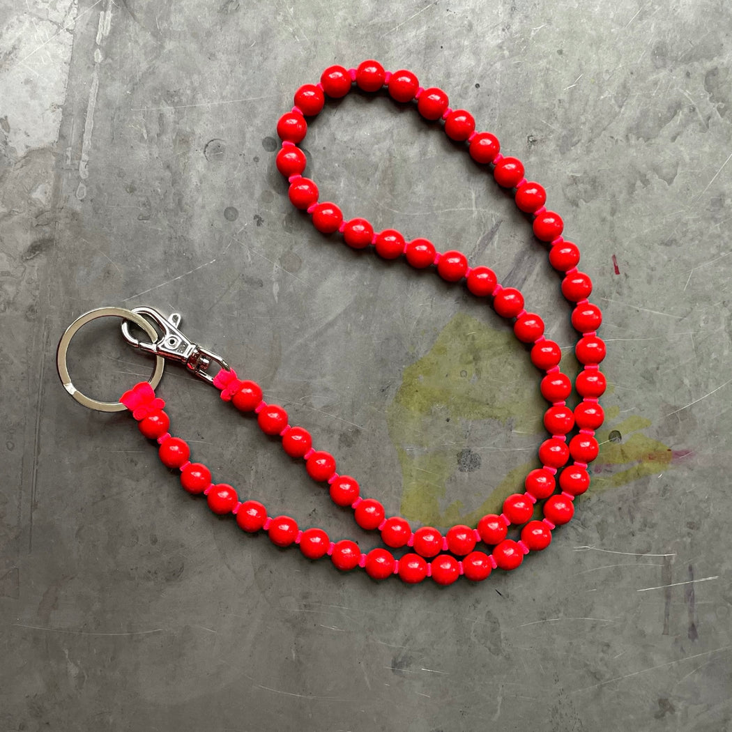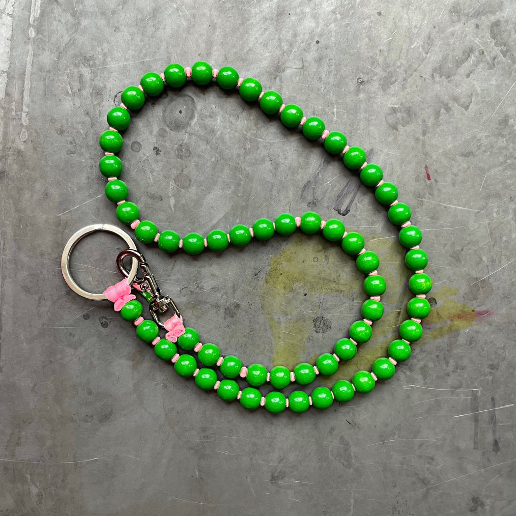 Key holder with elastic band and threaded wooden beads. Metal rings and clasp.