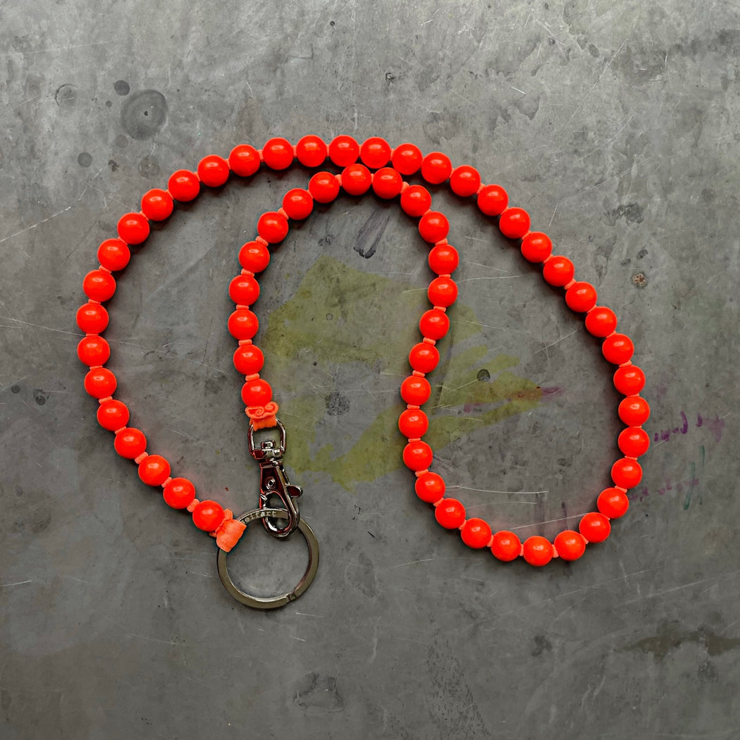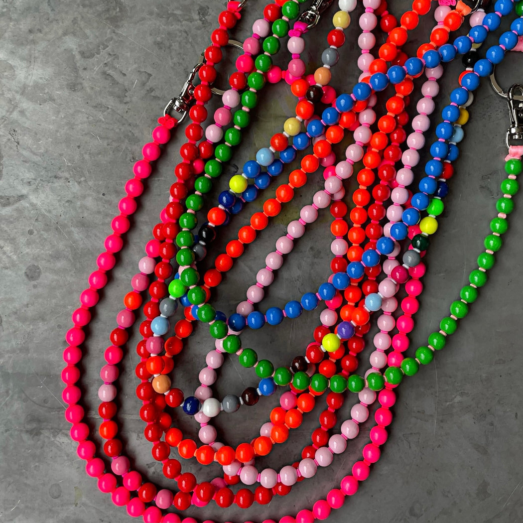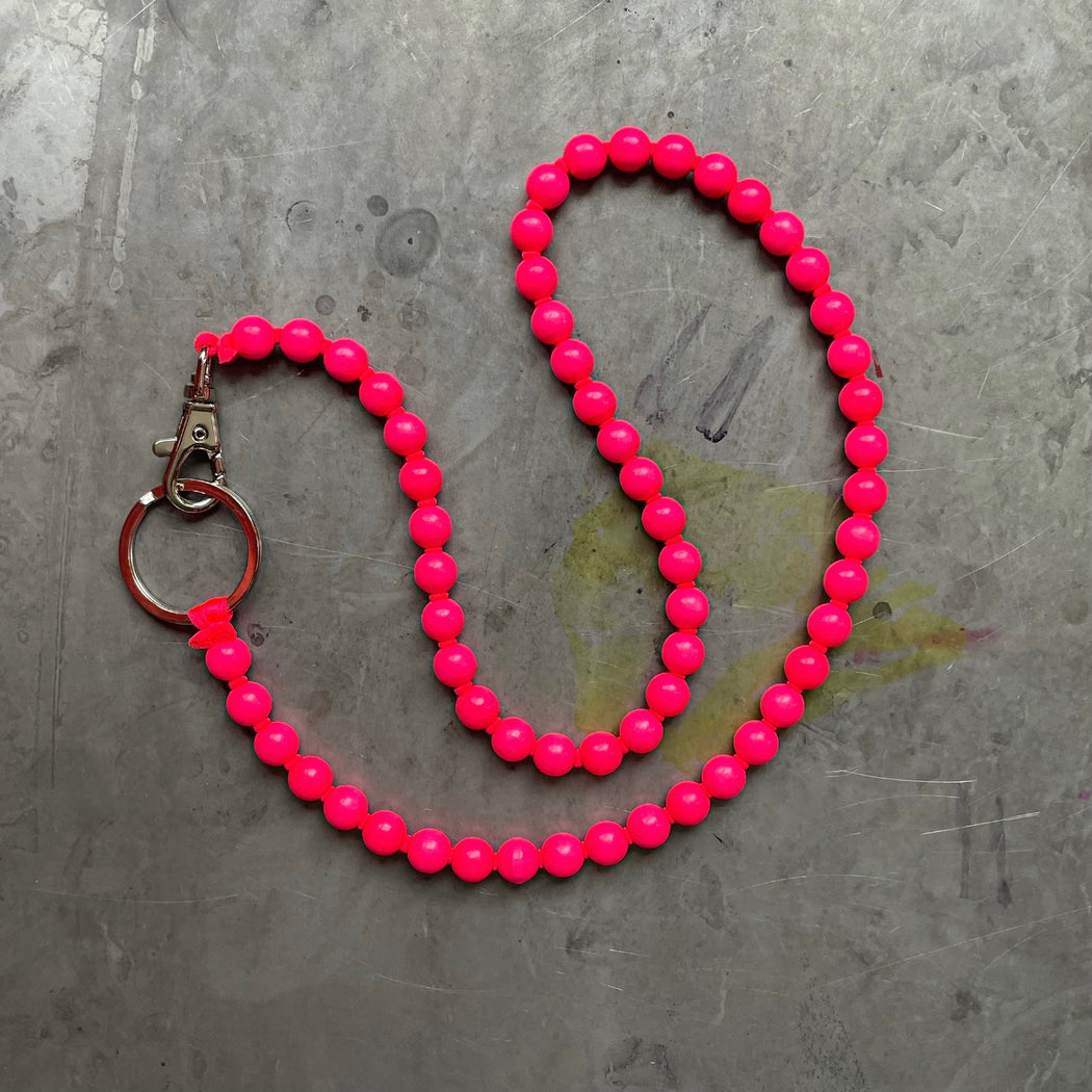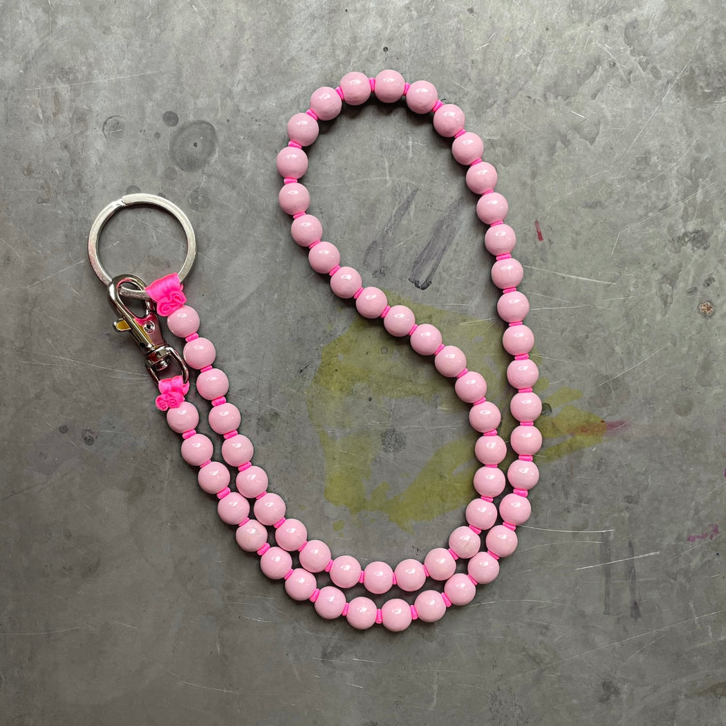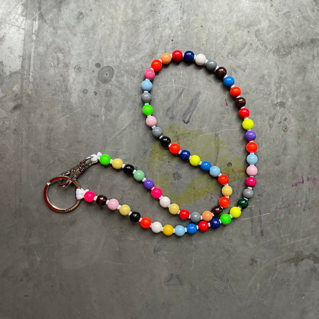 Key holder with elastic band and threaded wooden beads. Metal rings and clasp.