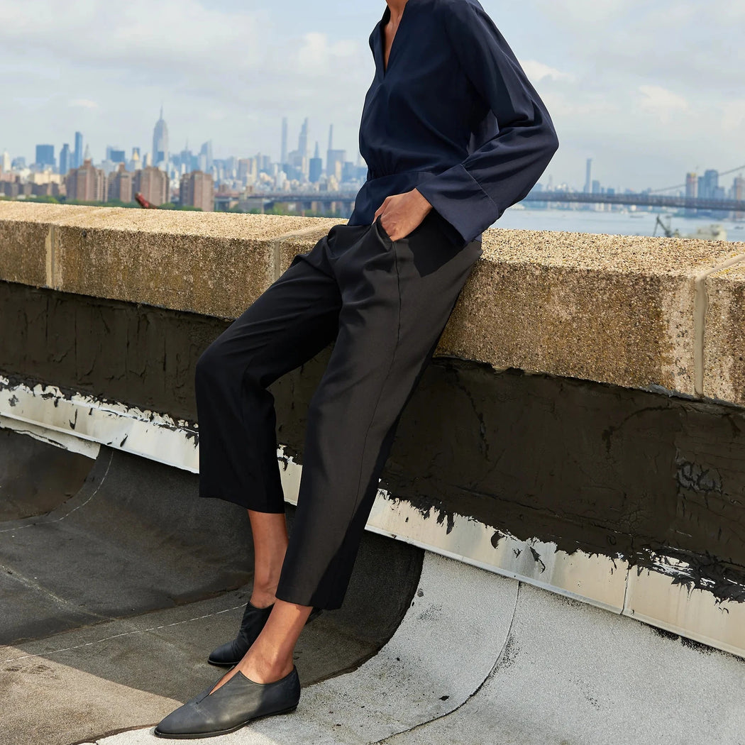 Silk charmeuse draped trouser features a straight relaxed leg, hidden pockets on a curved front seam and wide banded elastic waist