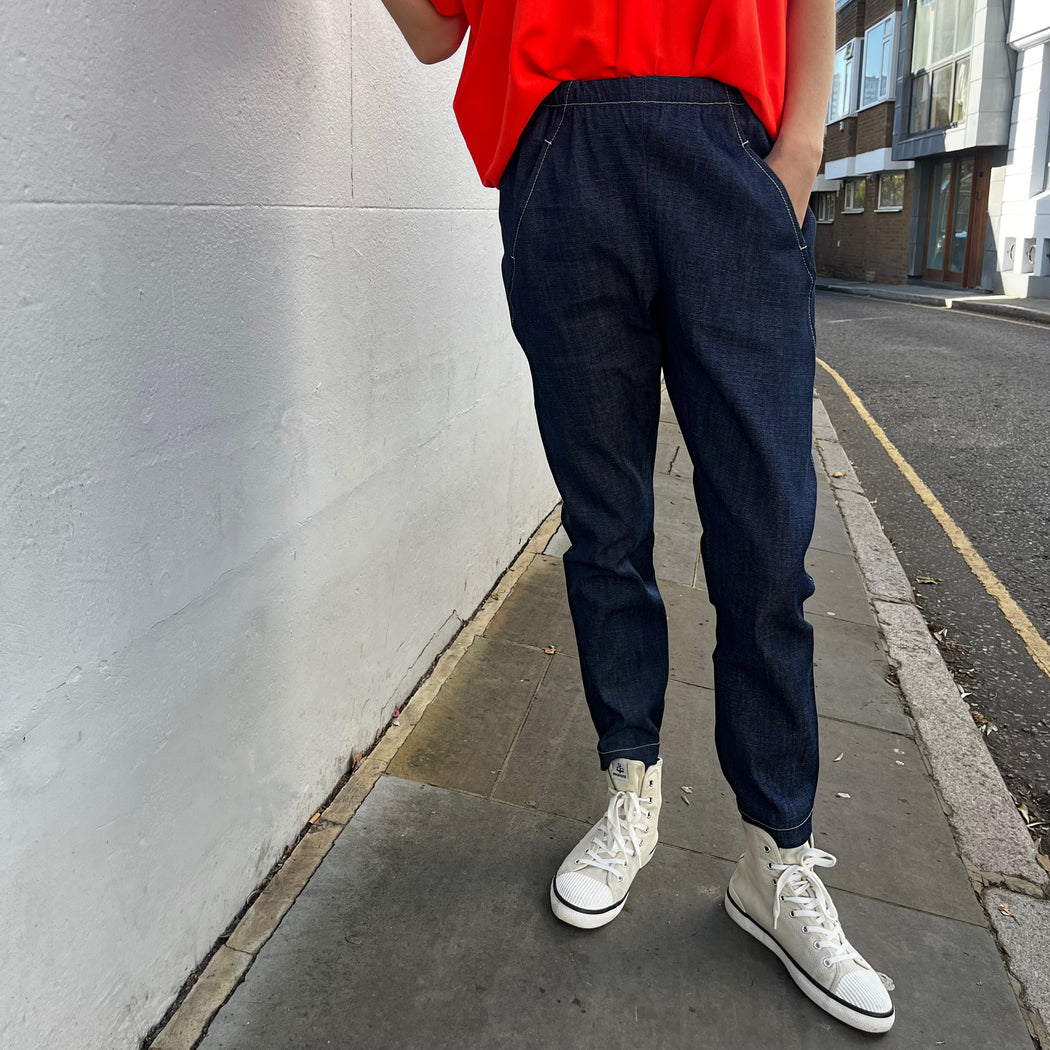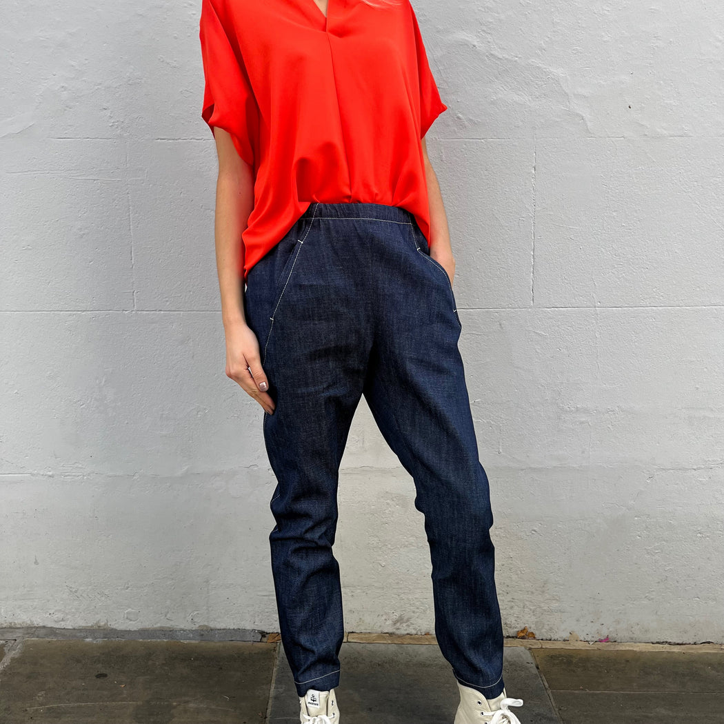 Best-selling Gabi Trousers in organic cotton, feature hidden pockets on a curved front seam and an elastic detail at the back of the cuff and waist.