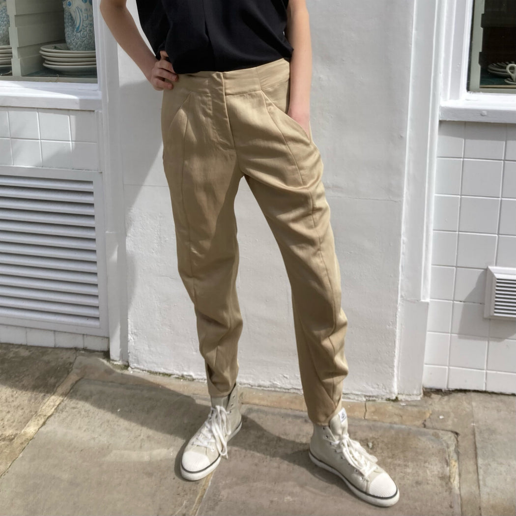 Recycled viscose pant features a banded waist, front pockets and draped silhouette with angled detail at cuffs. Front zip, hook closure.