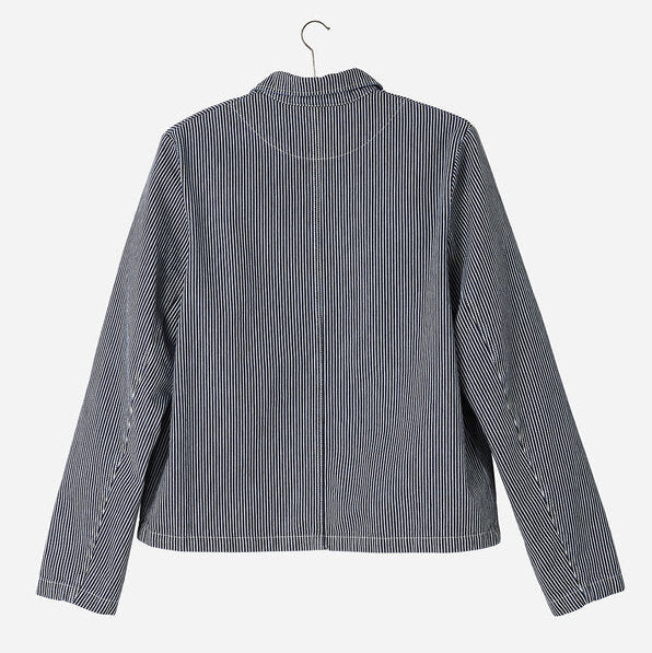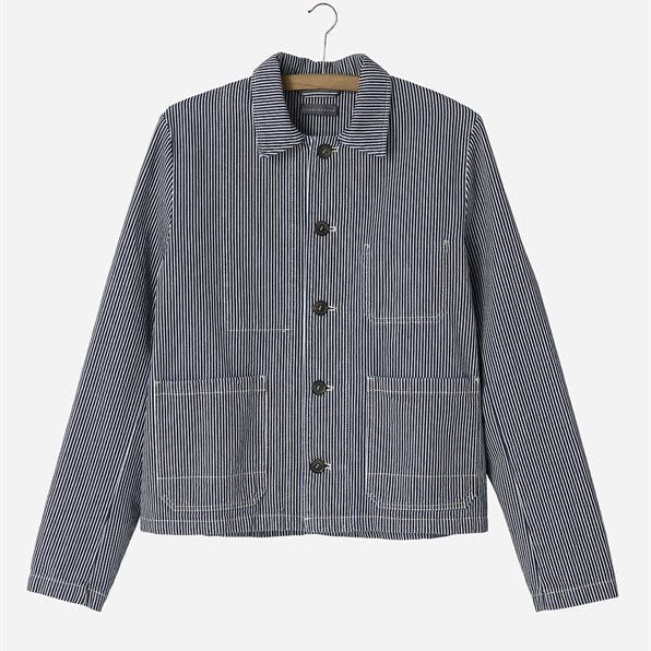 orker’s jacket in organic cotton twill inspired by vintage workwear. It has a flat collar, recycled plastic buttons, two sewn on pockets at front, and one inner pocket.
