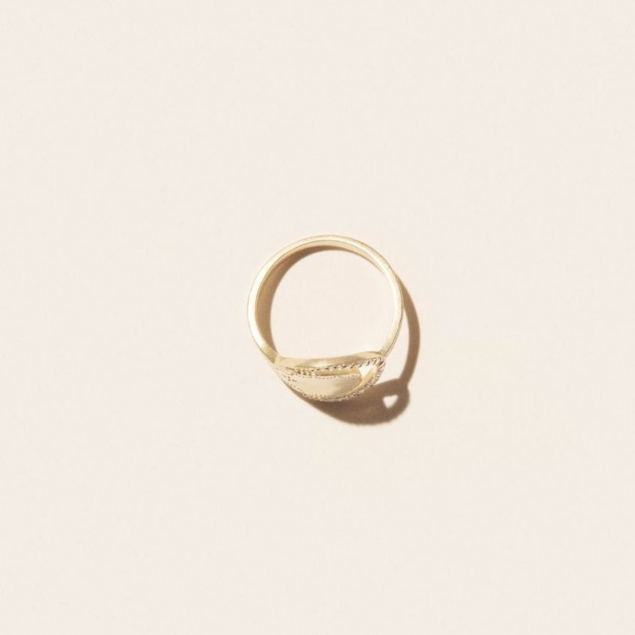 With an open medallion, an openworked ring, and necklaces with a gold detail that reveals the stone, Gigi conveys a sensual intention through its asymmetry, encircling and uncovering the material with a mattified gold and a ring of white sapphires.
