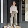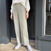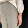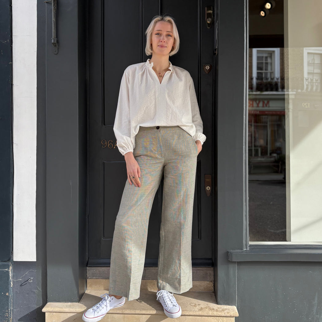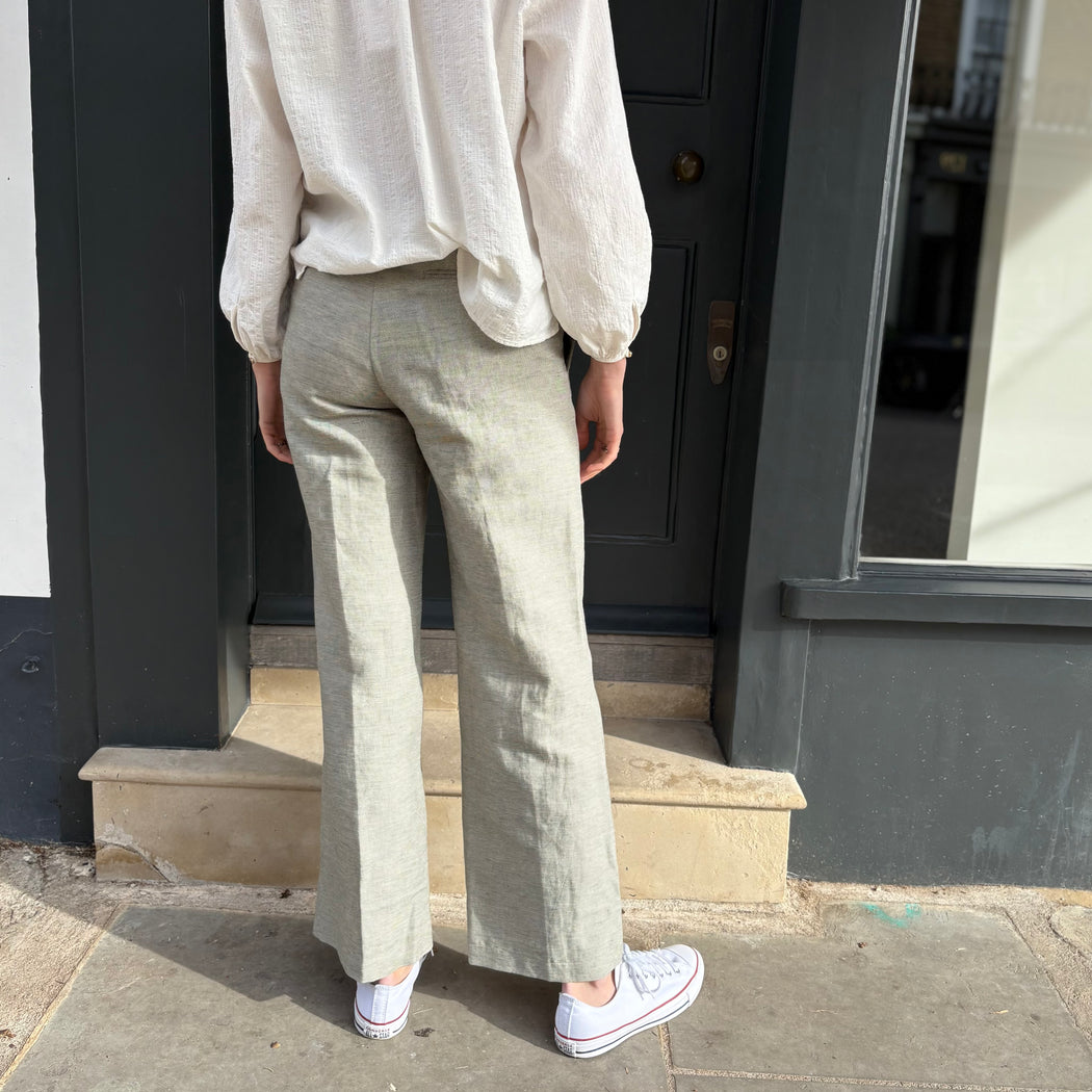 Speckled green and white linen trousers, zip and button closure and elasticated back. A relaxed leg.
