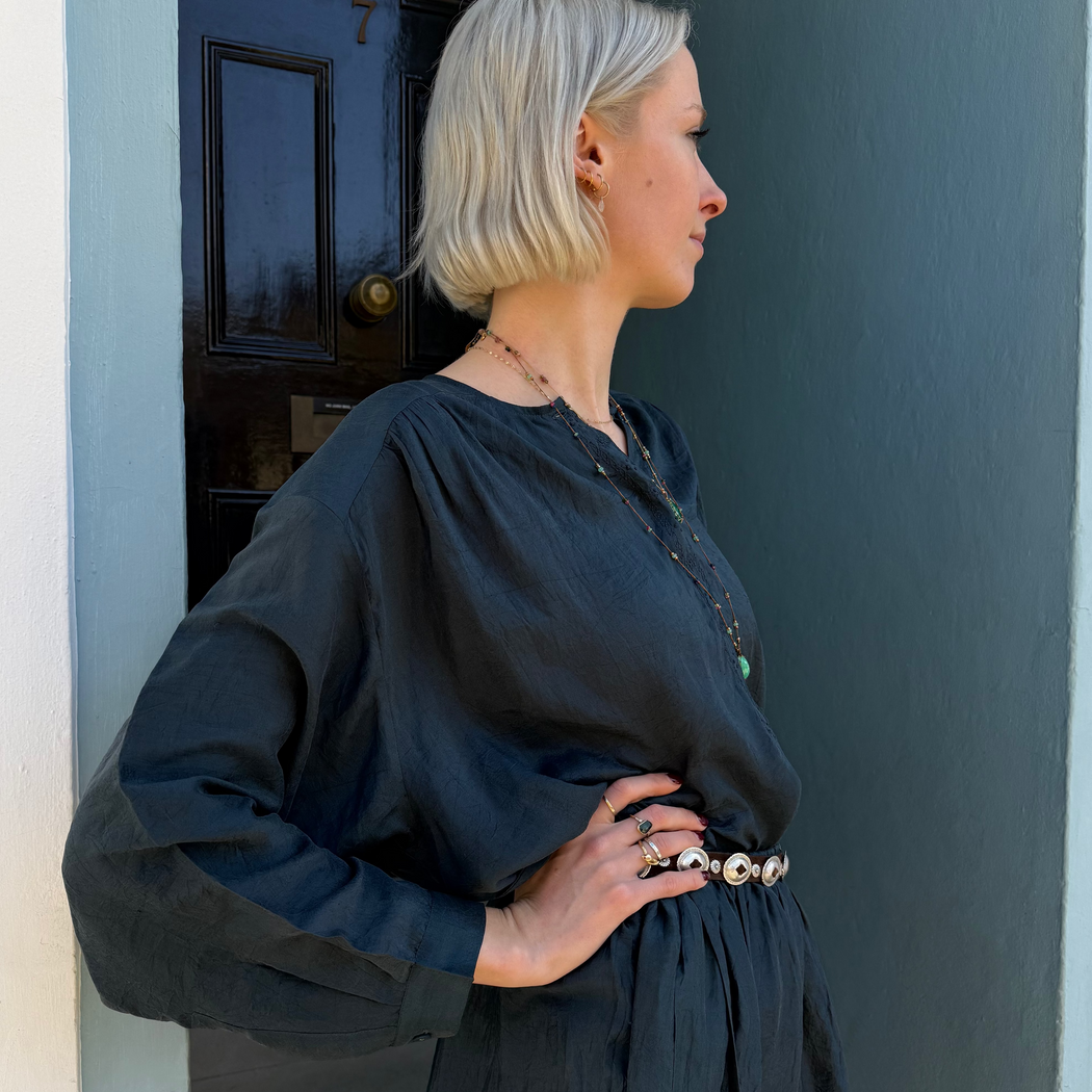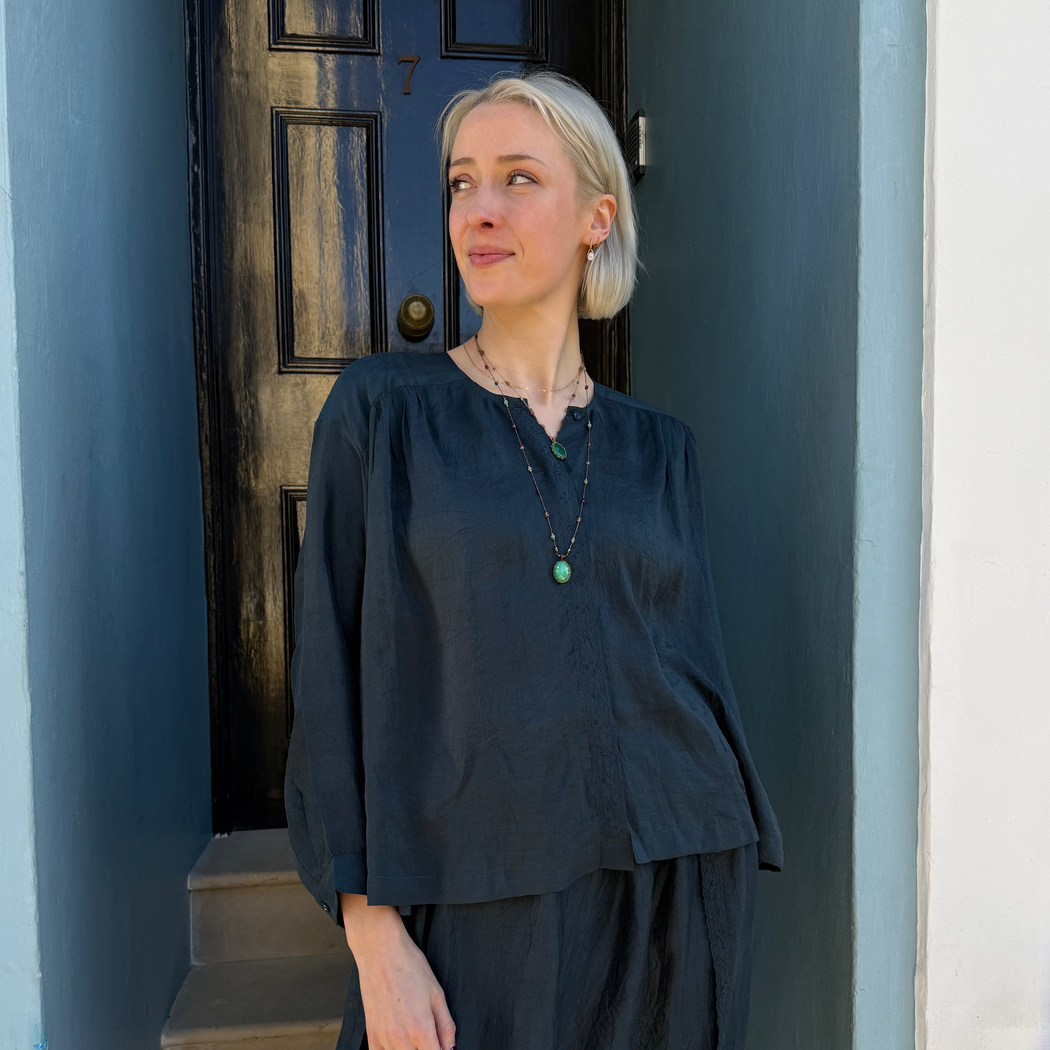 An indigo silk shirt with hidden button closures and hand embroidered detailing.