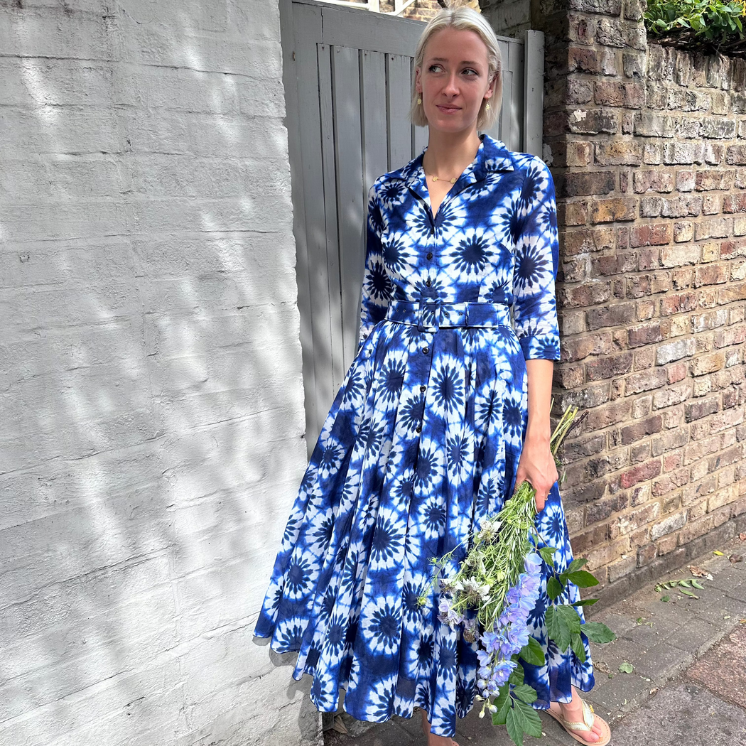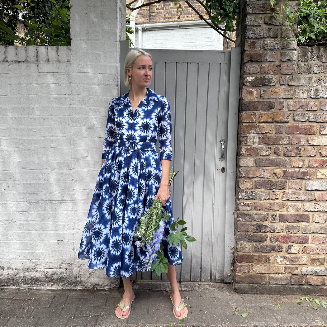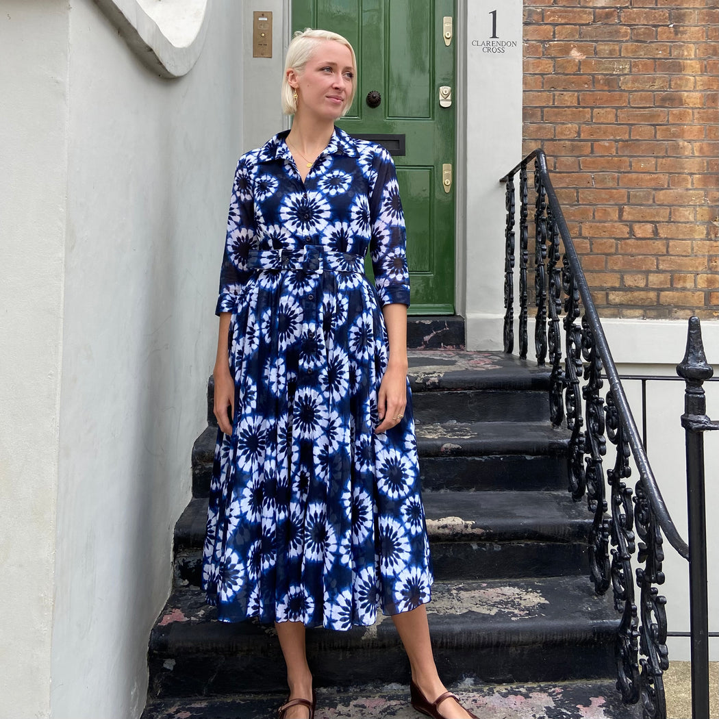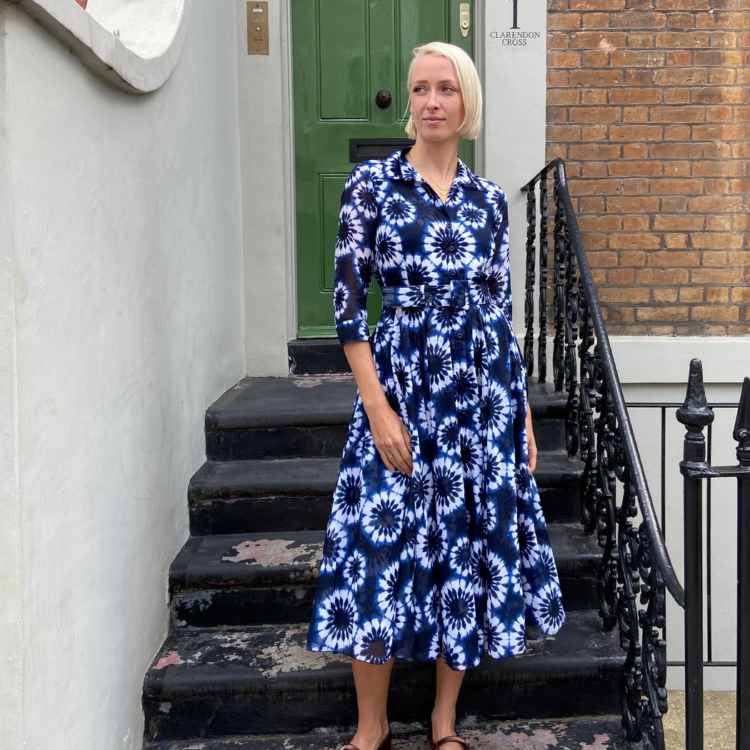 The Aster dress is one Samantha Sungs 50's inspired pieces. With an individual shibori pattern wrapping round the bottom of the skirt and on the top and a dark electric blue base. Subtly sheer 3/4 length arms, button closure down the front, comes with a buckle belt and a sash to switch up the way you wear this item!