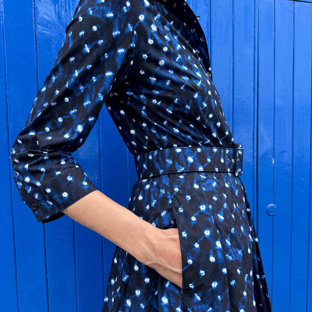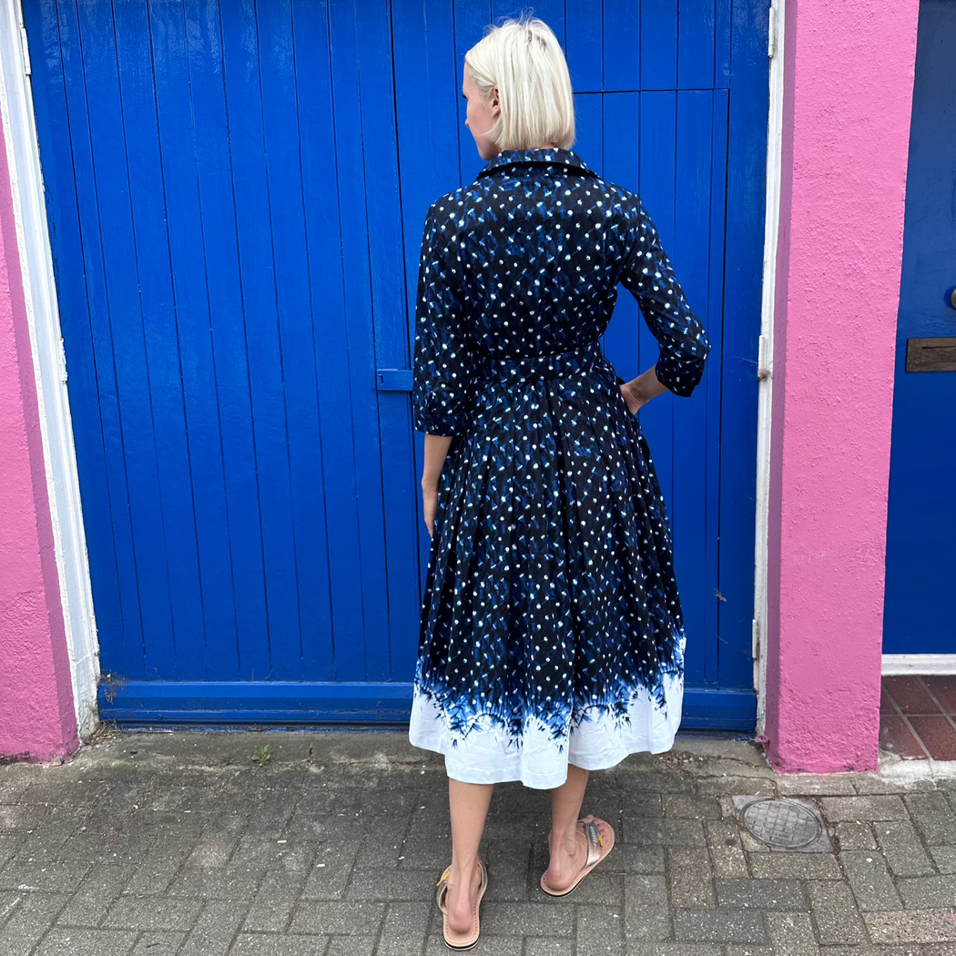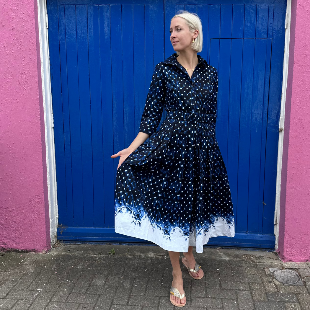 This is Samantha's Sung's most popular dress, the signature Audrey. The cotton stretch fabric, is both forgiving and flattering, firming the silhouette. This dress perfectly combines a 1950’s feminine shirt-waister style with a contemporary print.