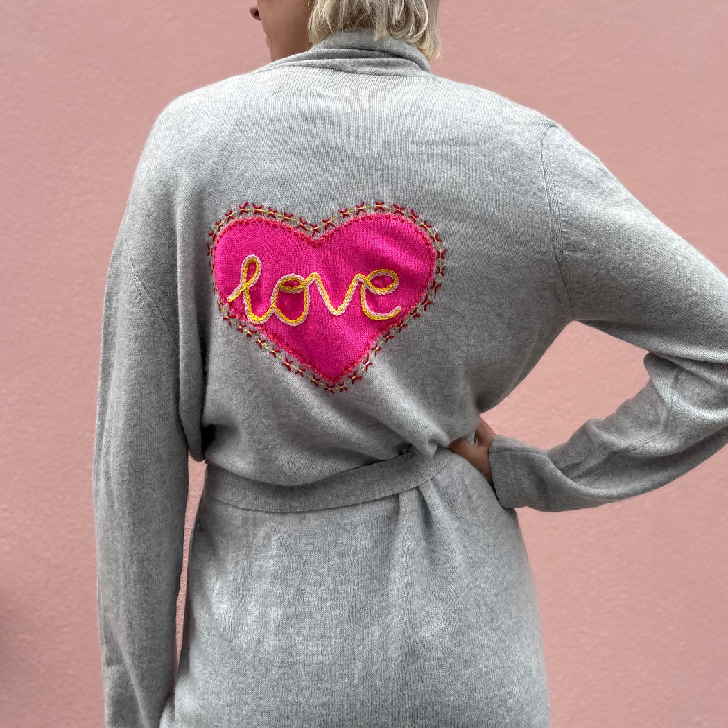 The Cross Cashmere Love Embroidered Dressing Gown in Grey Pink Heart My cart