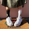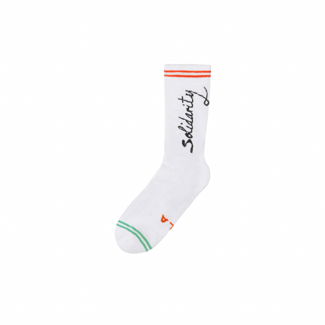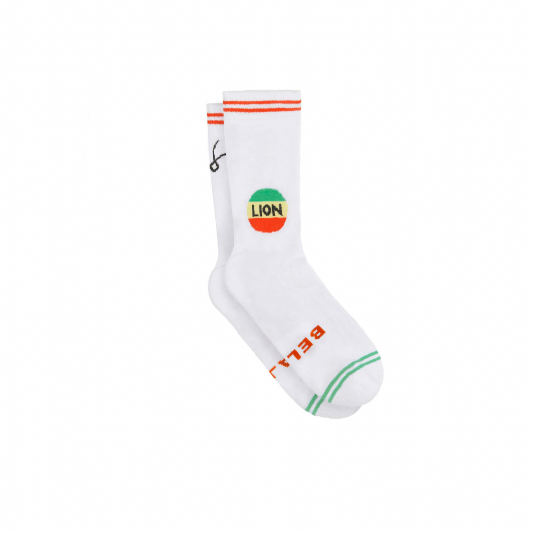 Bella Freud's lion socks, with solidarity printed on the inside ankle and finished with red and green stripes.
