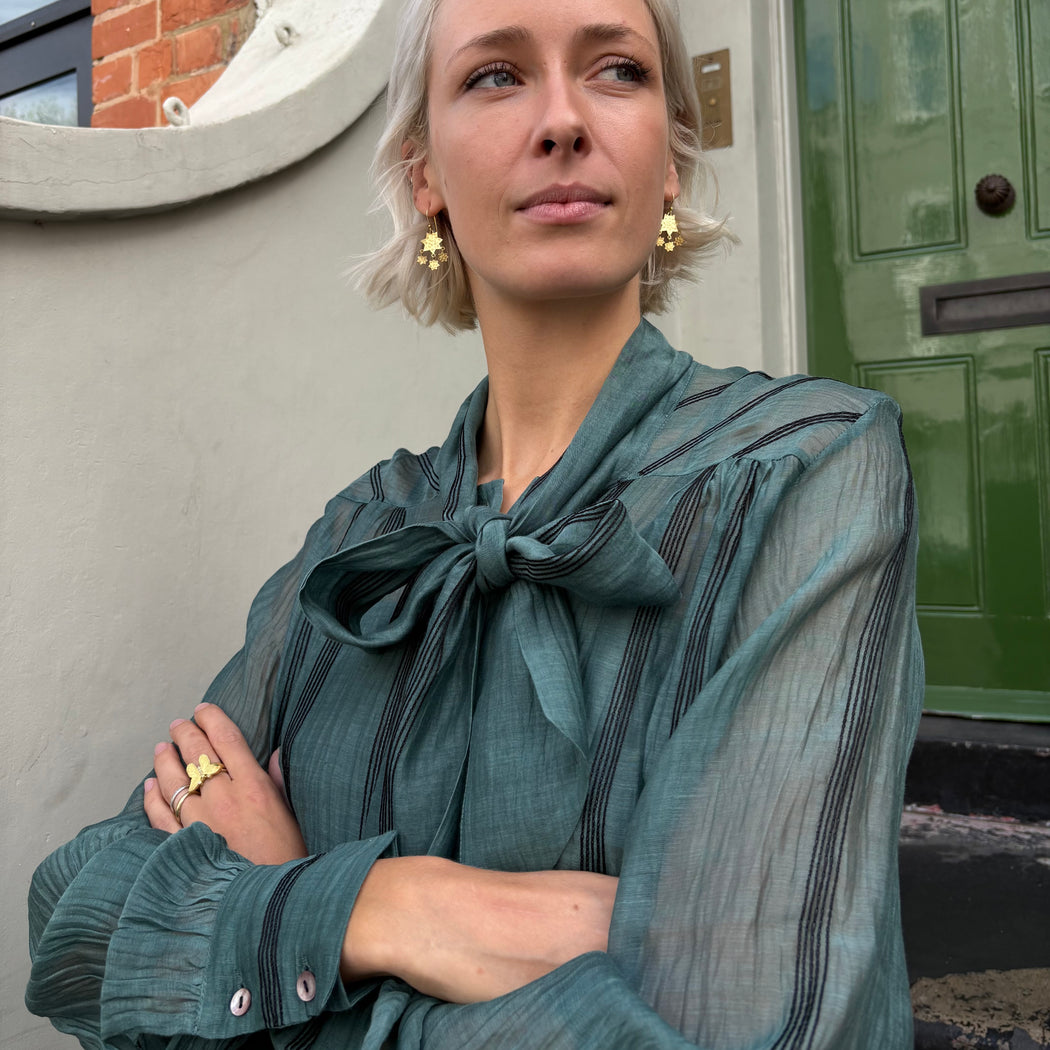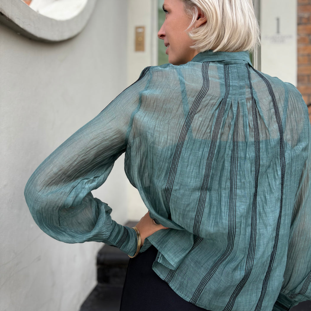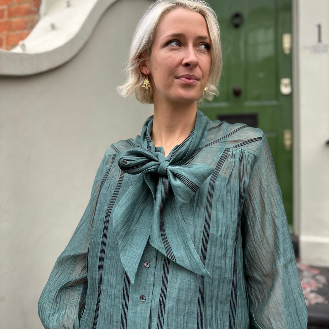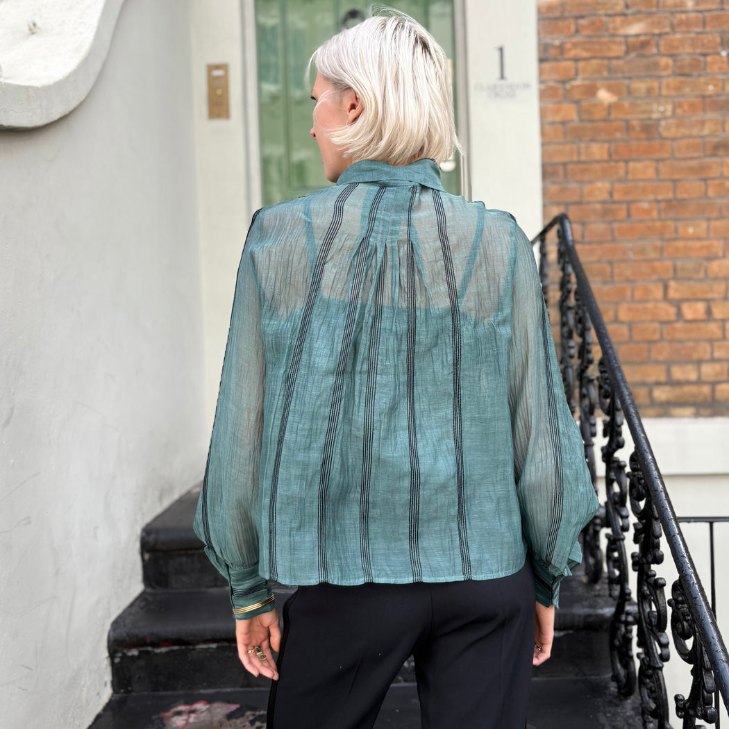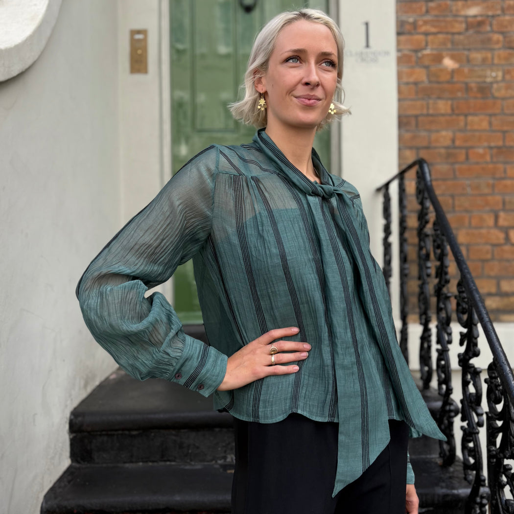 A gorgeous sheer cotton silk mix blouse with a pussy bow tie that can be worn tied or loose. Fine black embroidered stripes add to this gorgeous teal blouse. Comes with a camisole.
