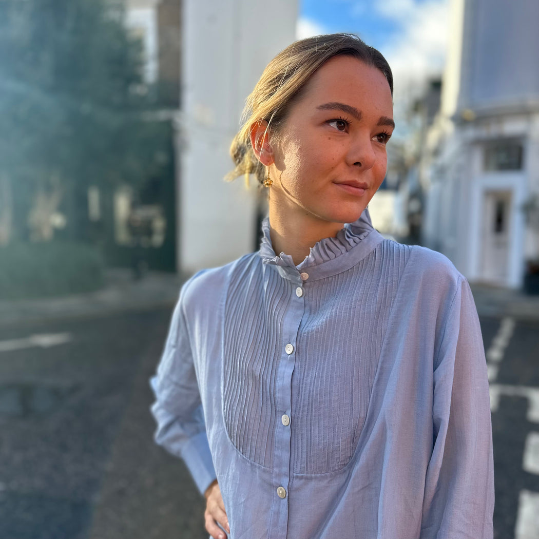 Introducing the Andrea Shirt crafted in light silk and cotton– a breezy blend of elegance and comfort perfect for sunny days. The delicate frill collar adds a touch of feminine charm, while the pintuck detailing along the yoke brings a sophisticated, textured element to the design.