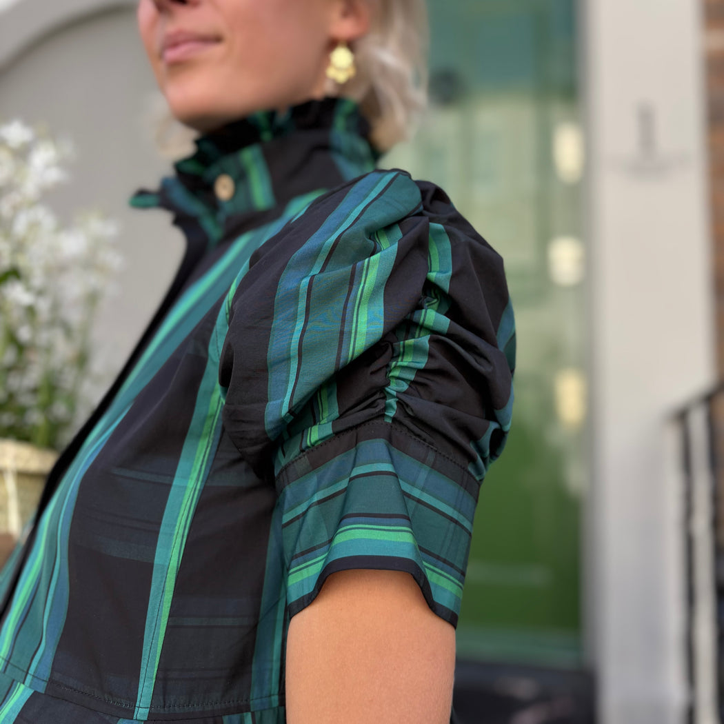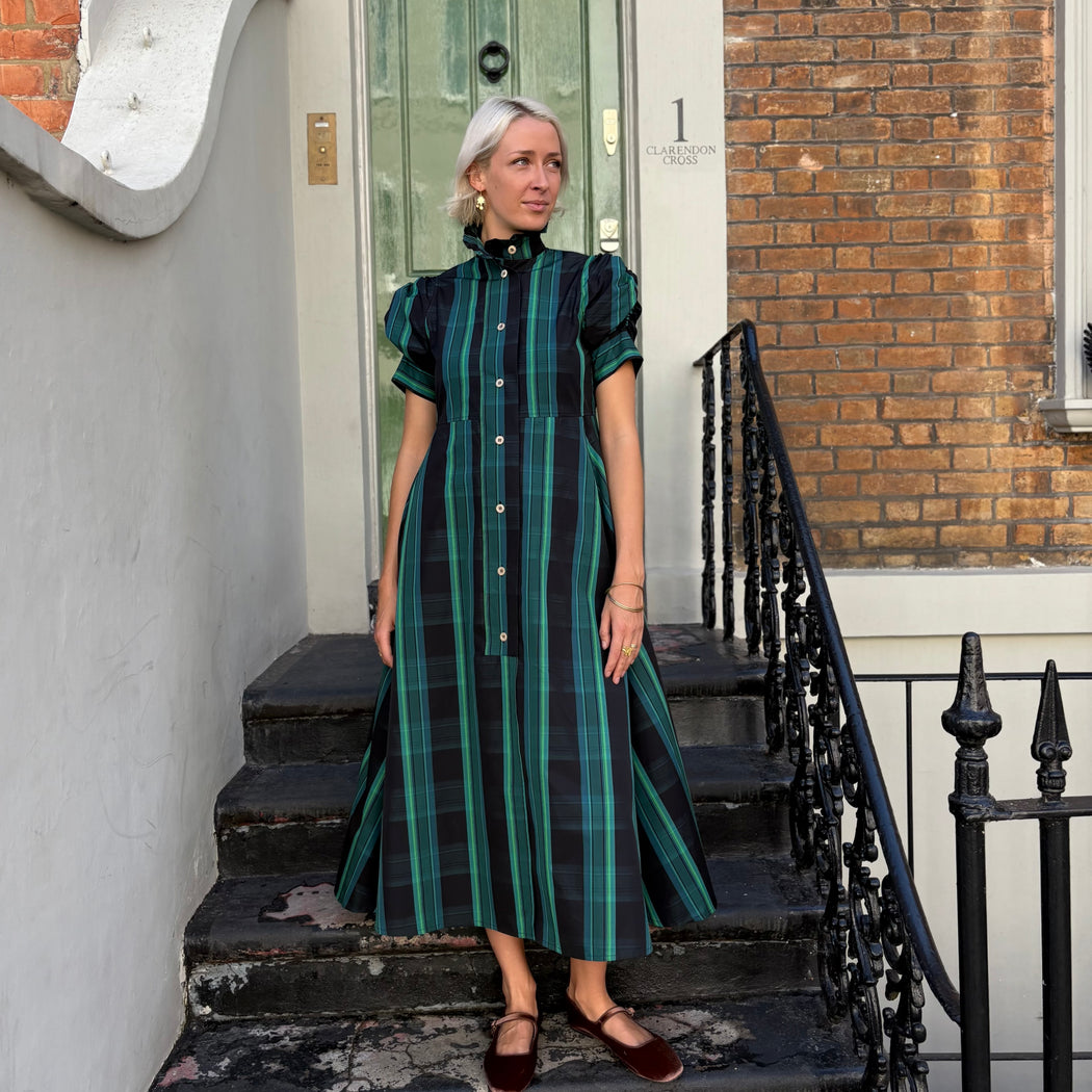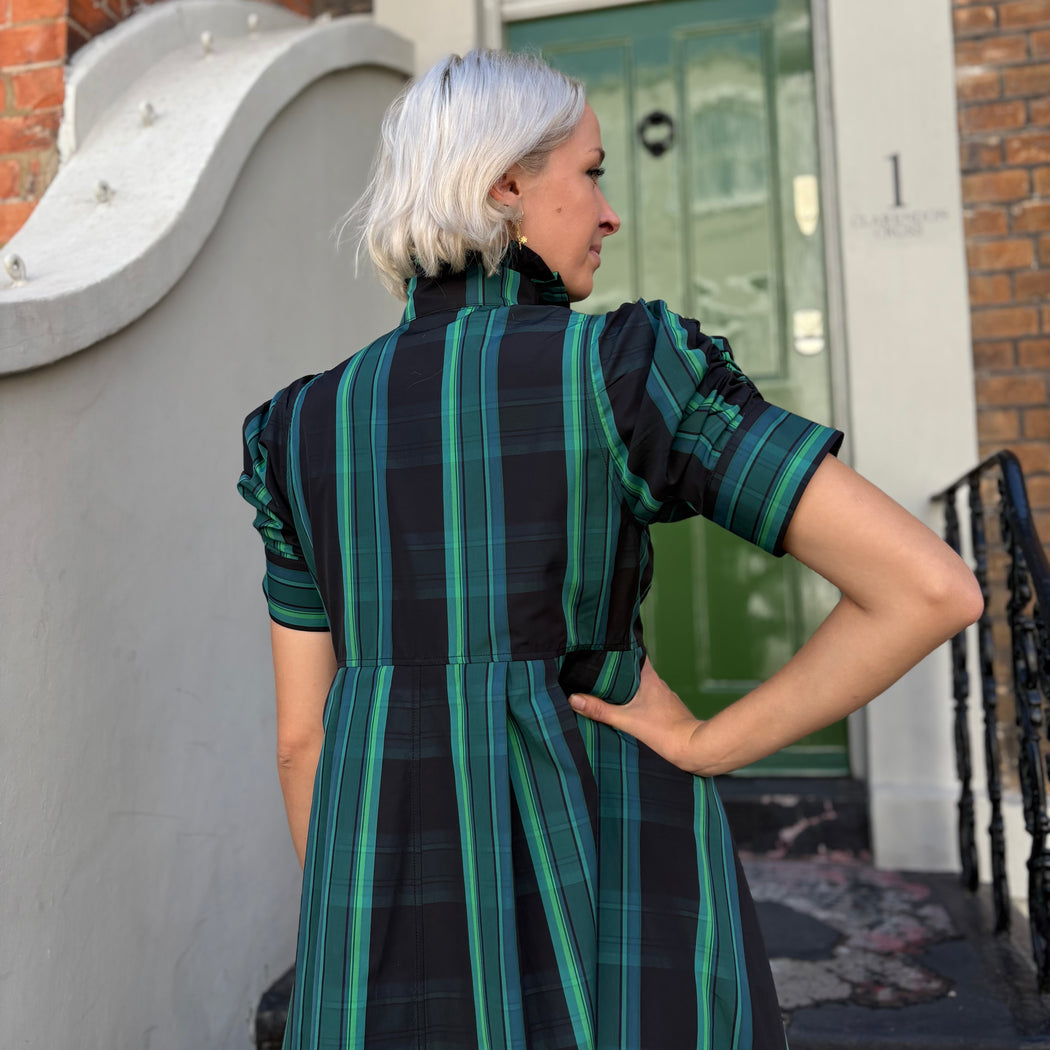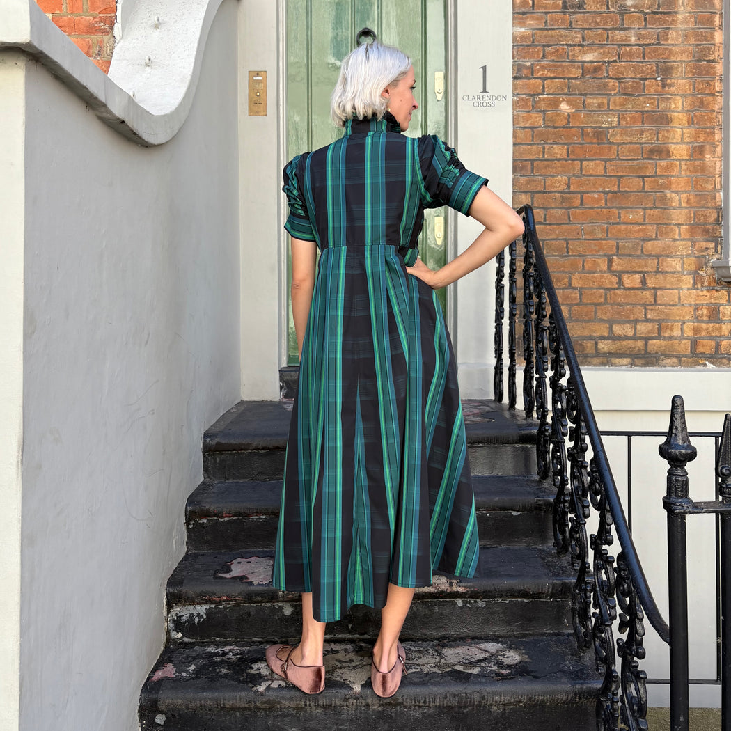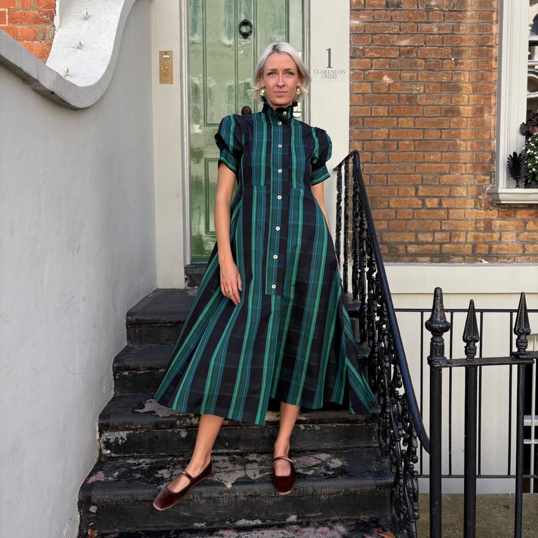 With its frilled collar and gigot sleeves, the Venetia dress is a wink to the Edwardian era. Bold green stripes add a flare to this sophisticated dress.