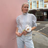 Linen and cotton short sleeved shirt. With eccentric ruffled and puffed sleeves and high neck. Button closure down the front.