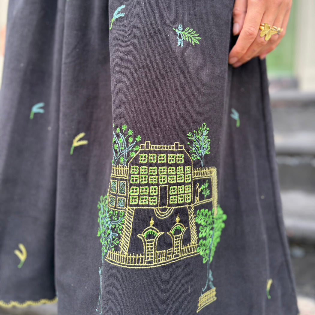 An A-line shape embellished by two hand-smocking patches front and back gives a subtle drape. Flat on the hips, refined tones of greens and gold yellows enhance the preciousness of the embroidery and makes the all look unique.