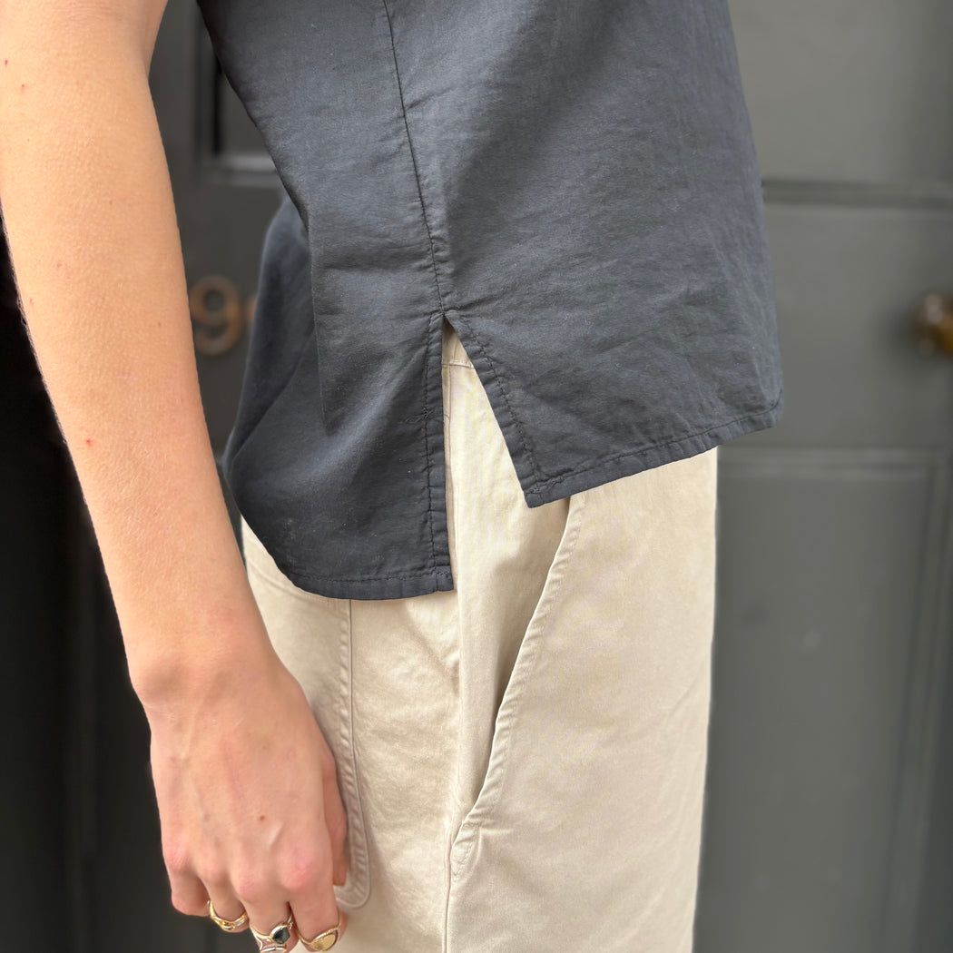 Soft cotton short sleeve shirt, with a flat collar and a boxy shape.